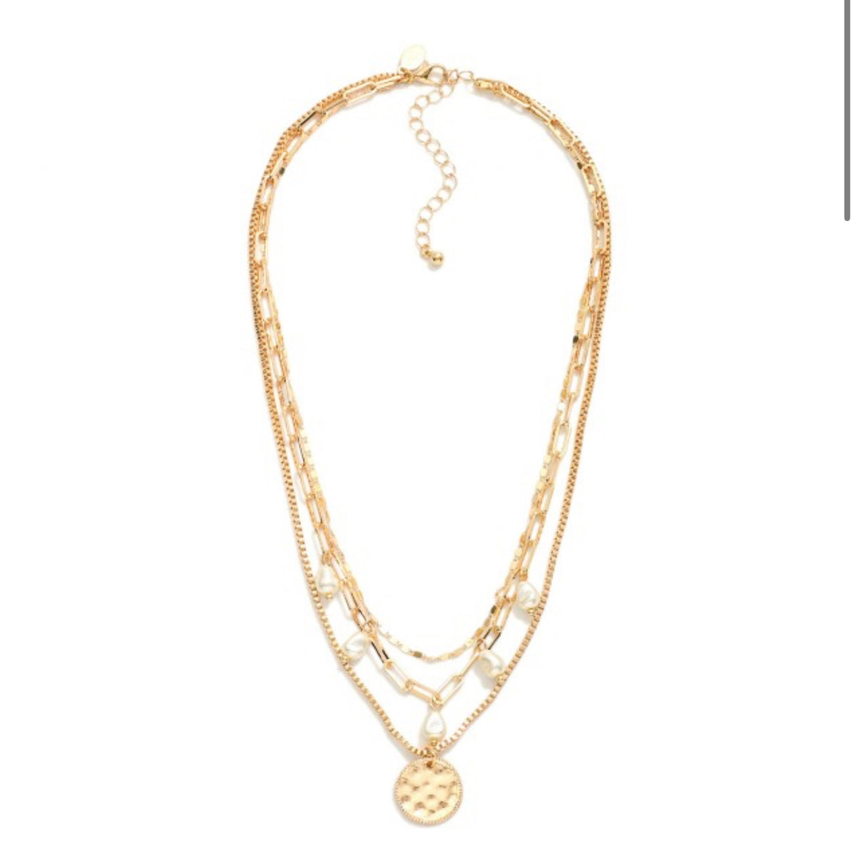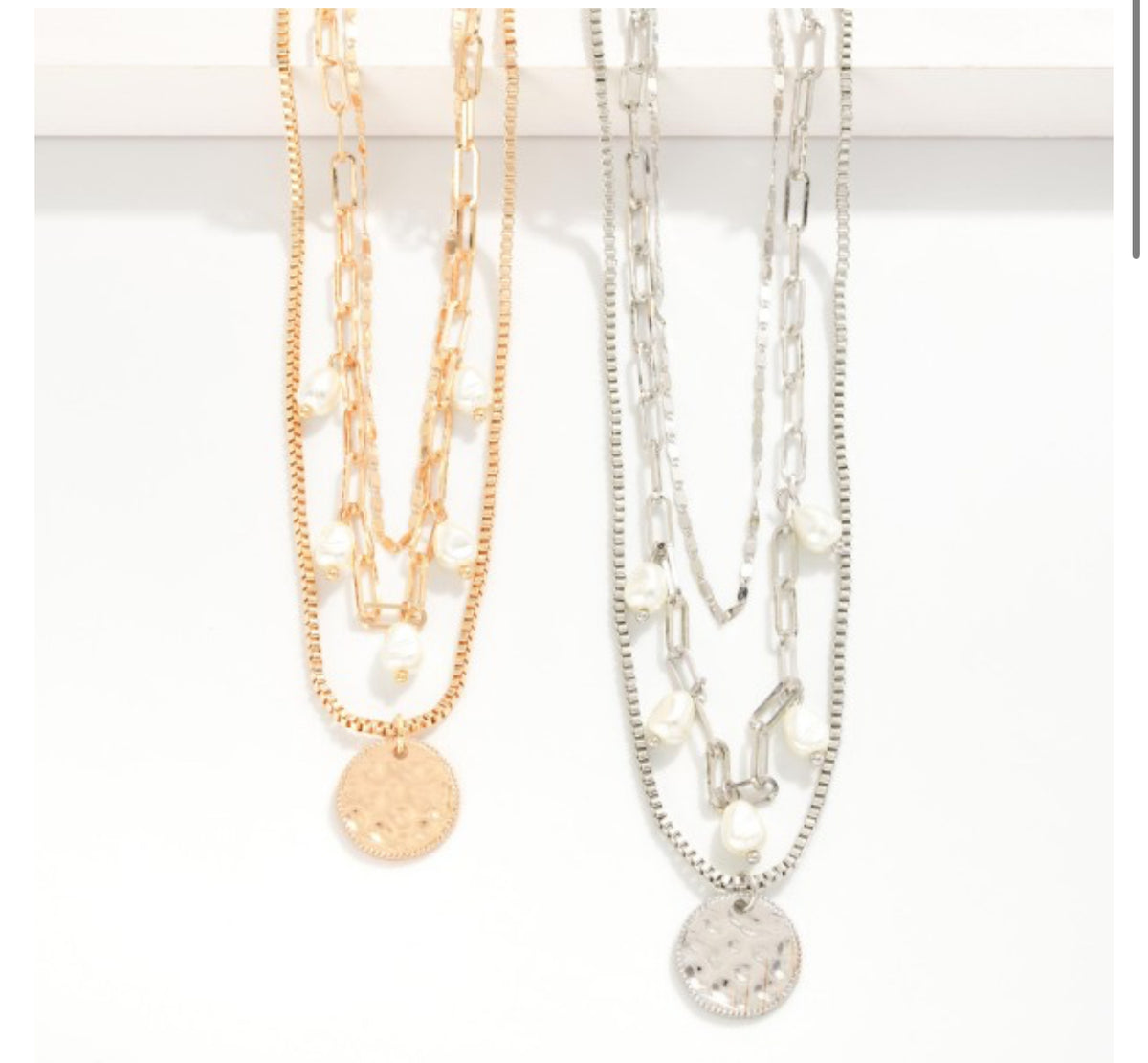 Layered Chain Link Necklace Featuring Pearls & Hammered Metal Circle Pendant