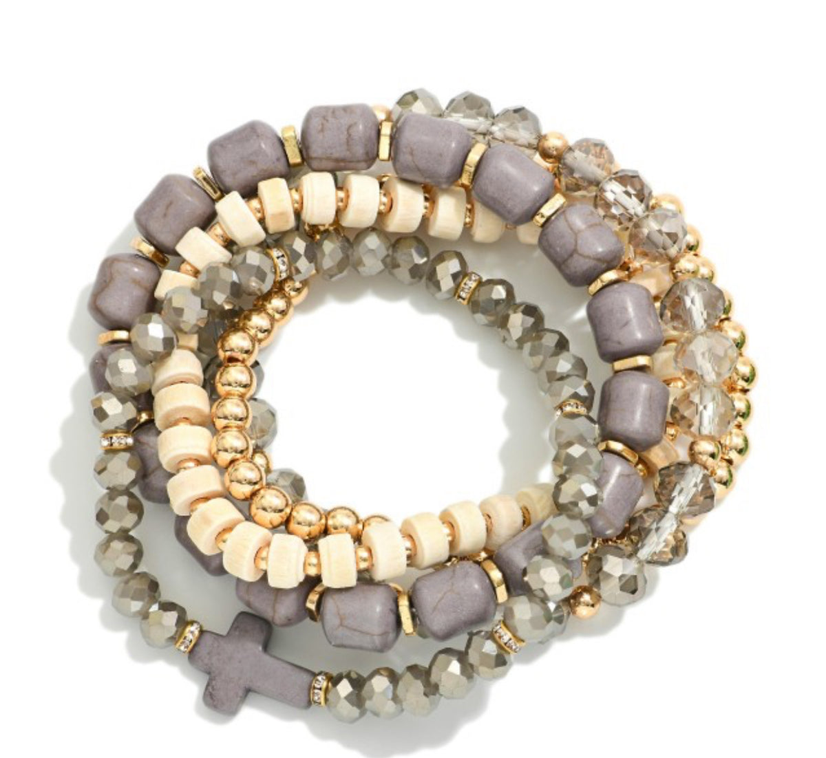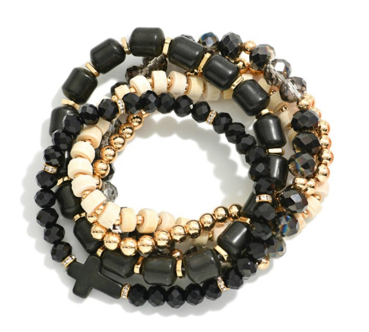 Set Of Five Beaded Stretch Bracelets Featuring Metal Tones, Stone, & Faceted Beads