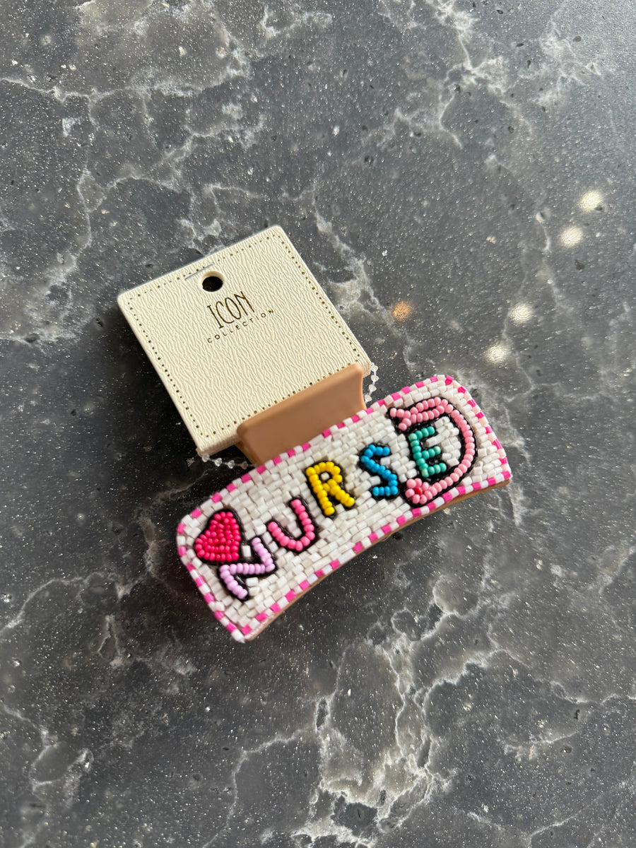 Seed Beaded "NURSE" Claw Hair Clip - Approximately 3" L