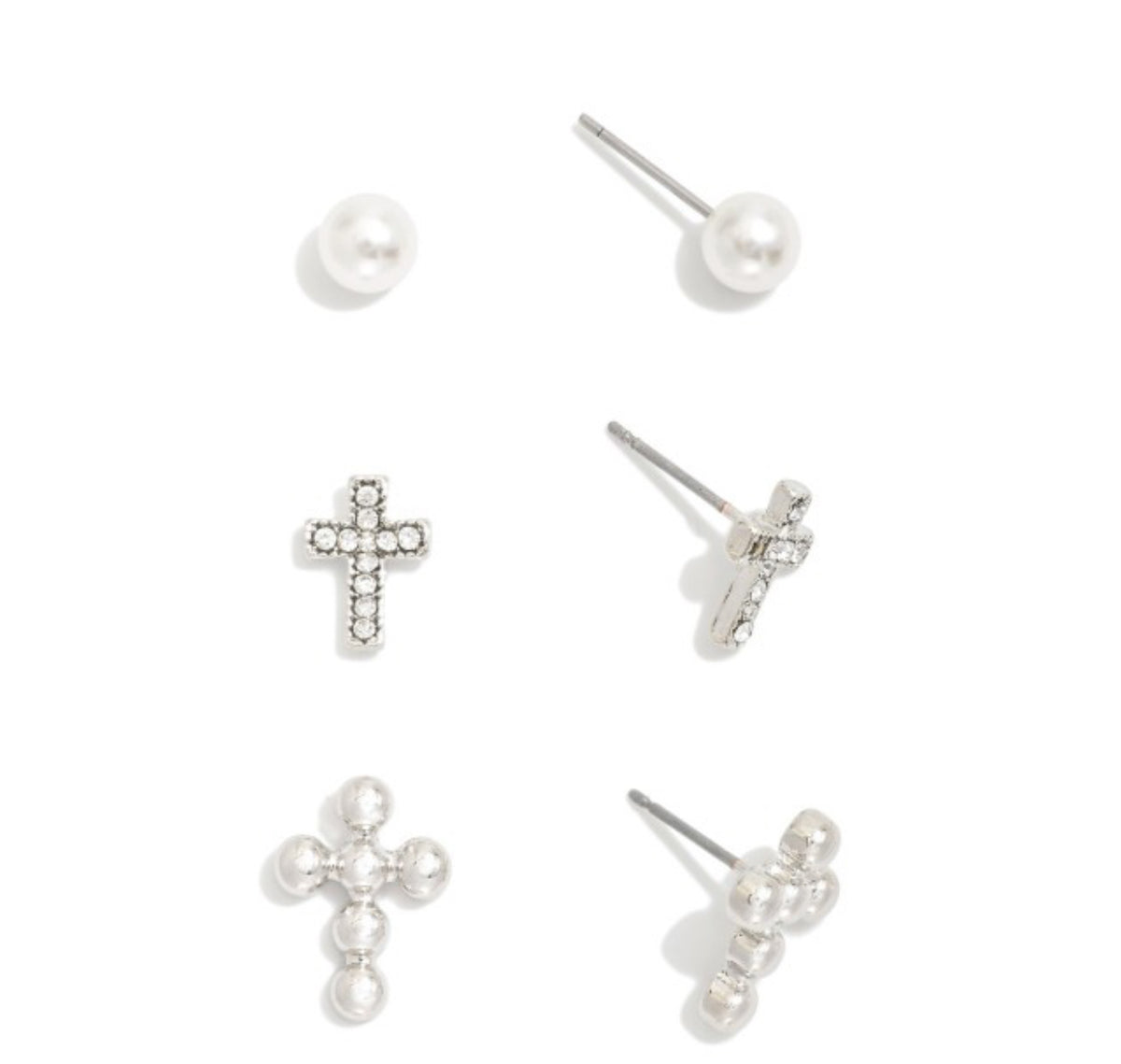 Set Of Three Metal Tone Cross Earrings Featuring Pearls And Rhinestones