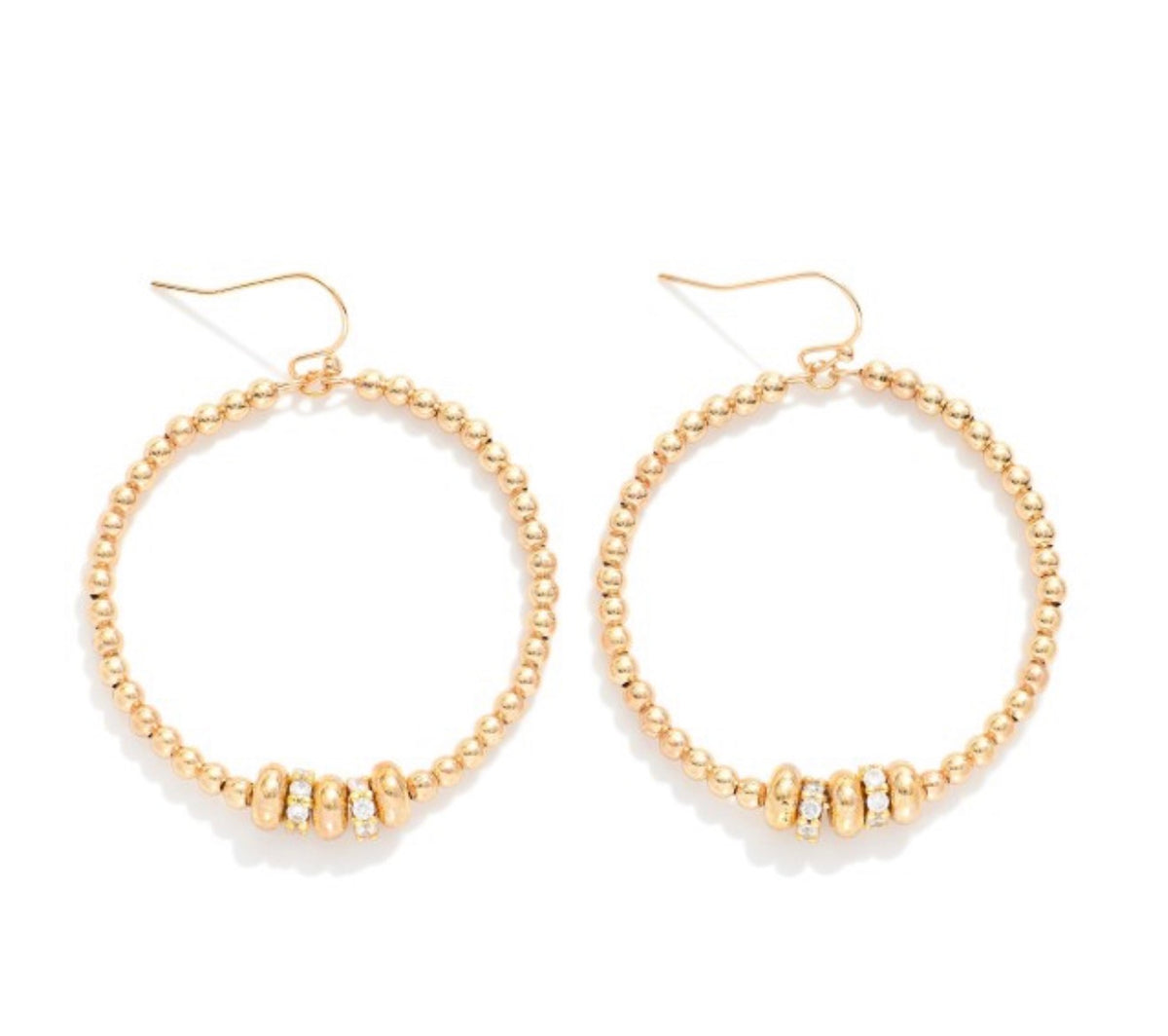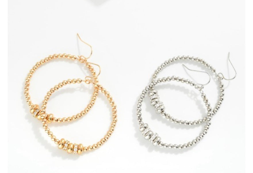 Metal Tone Beaded Hoop Drop Earrings Featuring Rhinestone Dish Details - Approximately 2" L