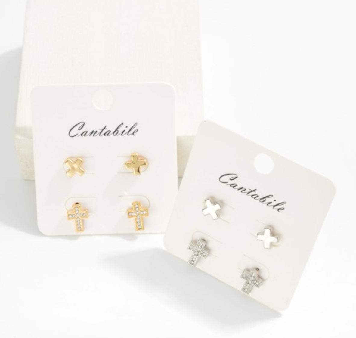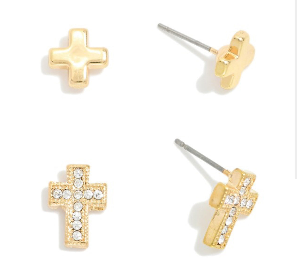 Set Of Two Metal Tone & Rhinestone Cross Stud Earrings