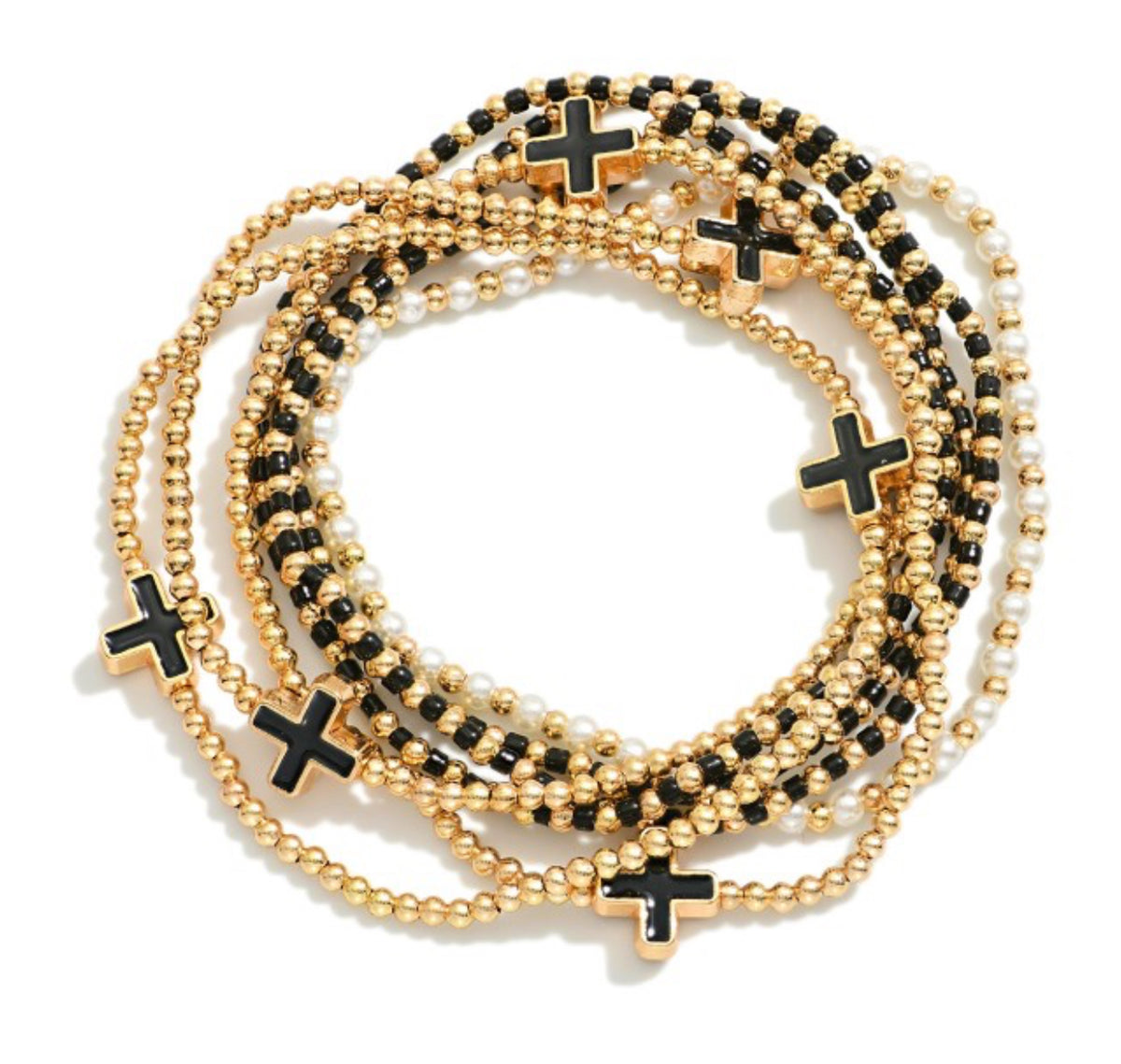 Set Of Seven Beaded Stretch Bracelets Featuring Metal Tones, Pearls, & Enamel Criss Cross Beads