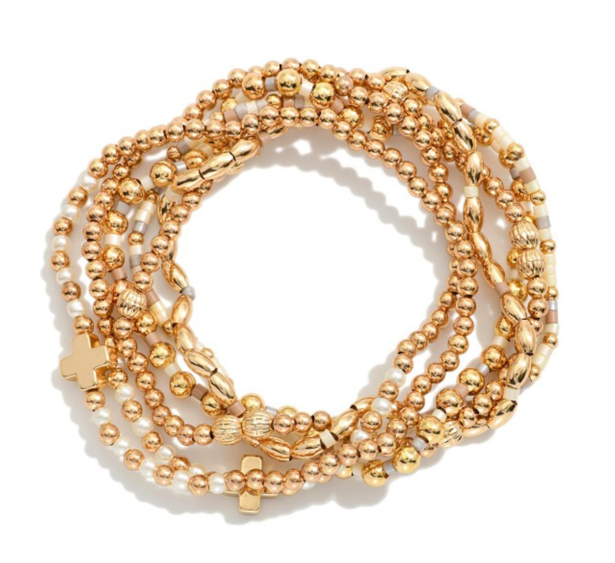 Set Of Six Beaded Stretch Bracelets Featuring Metal Tones, Heishi Beads, & Plus Crosses