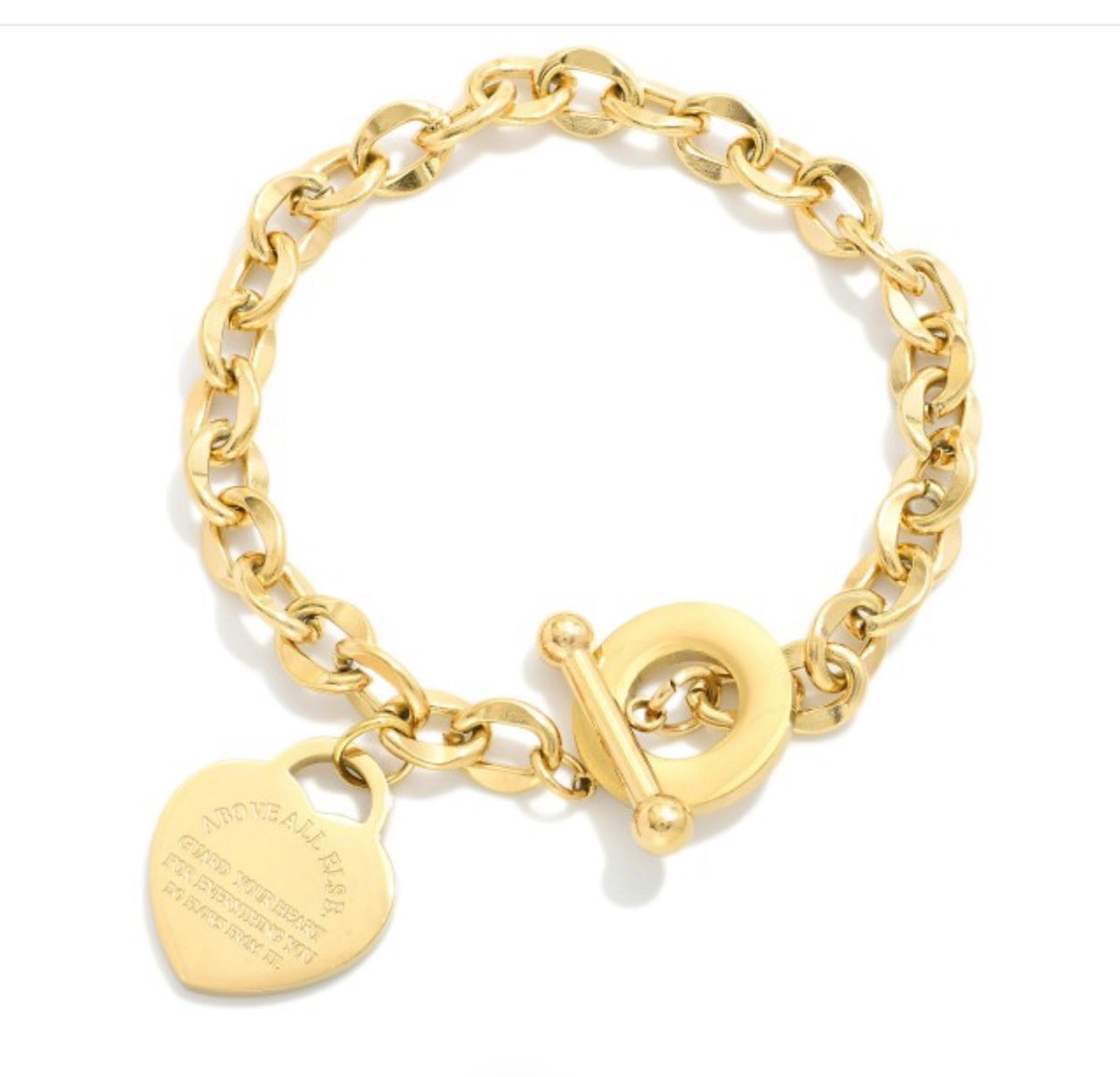 Chain Link Bracelet Featuring Engraved Metal Tone Heart & Toggle Clasp