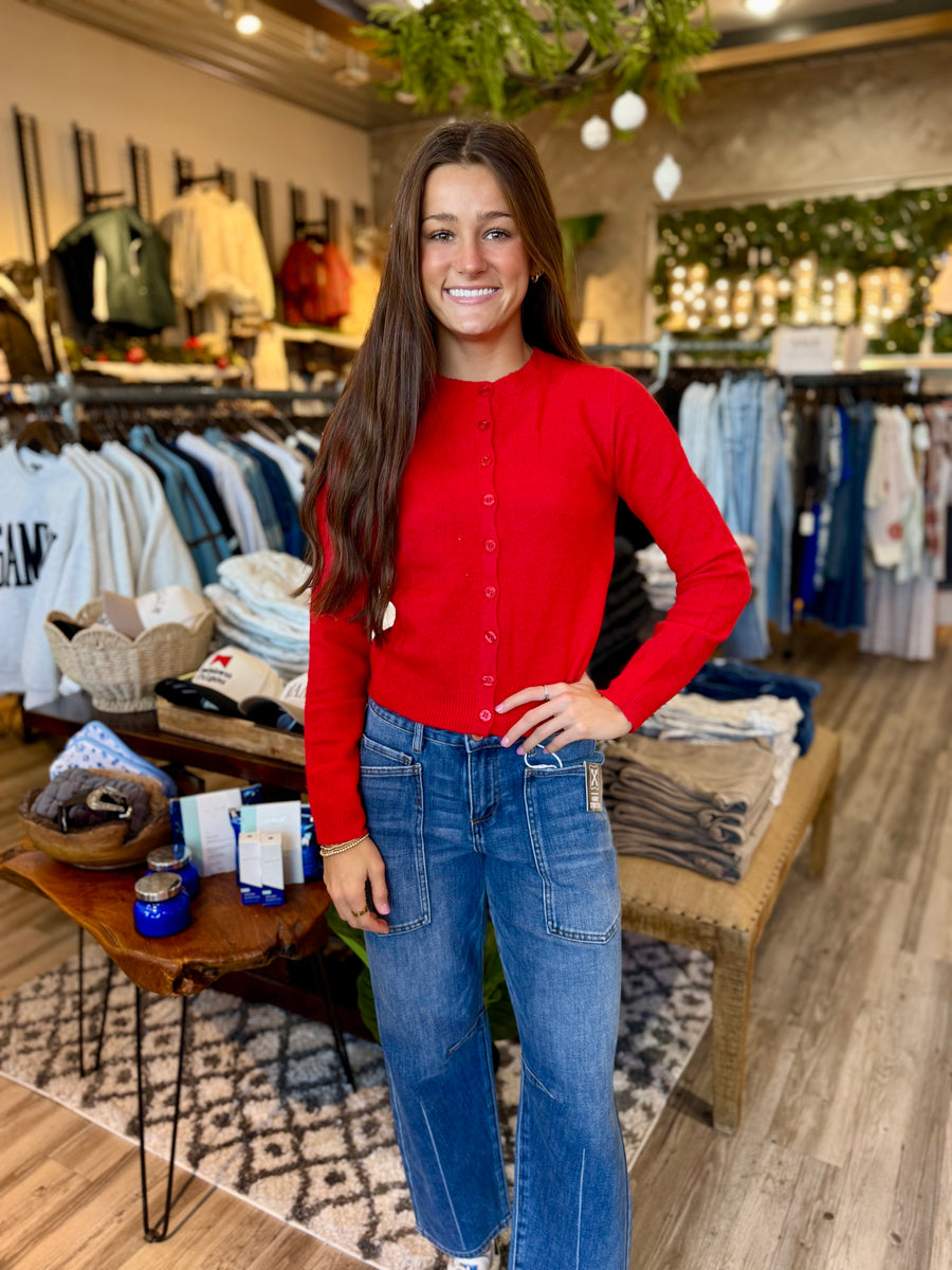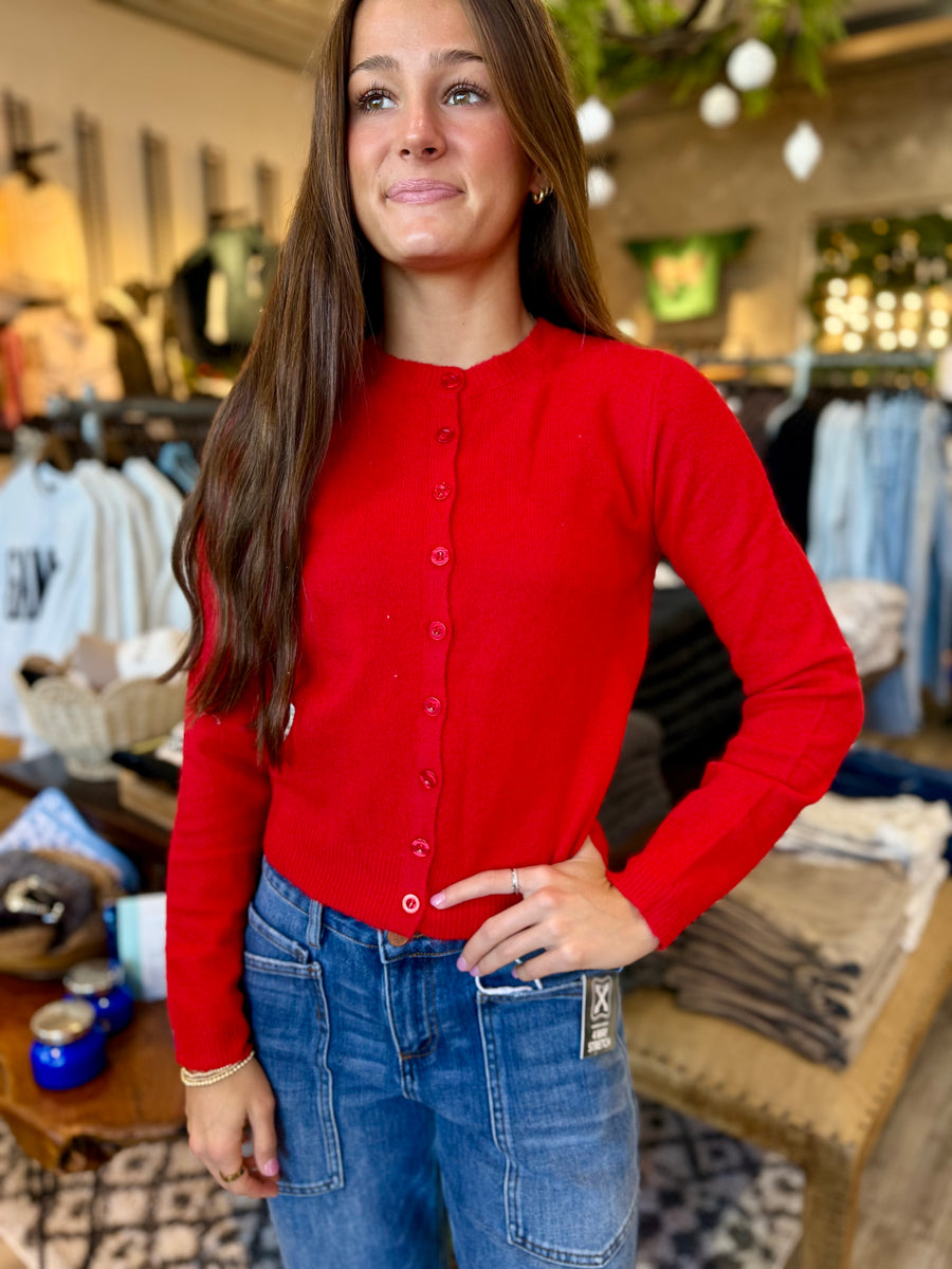 Effortlessly stylish and versatile, our Bright Red Button Down Cardigan is a must-have addition to your wardrobe. The classic design and true-to-size fit make it a staple piece for any outfit. Stay cozy and chic with this essential.