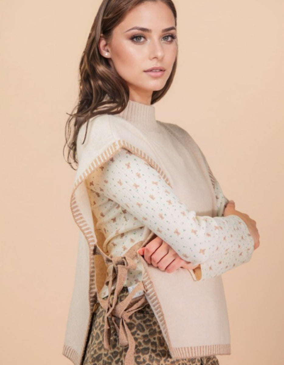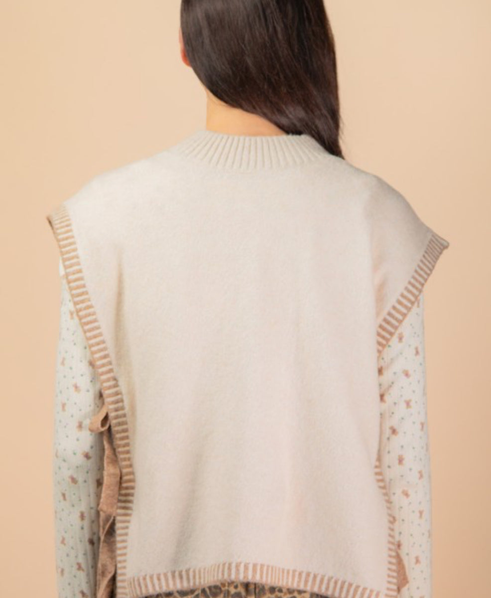 Keep warm and fashionable with our Cream City and Tan Outline Side Tie Pullover Vest Sweater. Perfect for layering, this vest sweater offers comfort and style for any occasion. Stay cozy and trendy in this must-have piece.