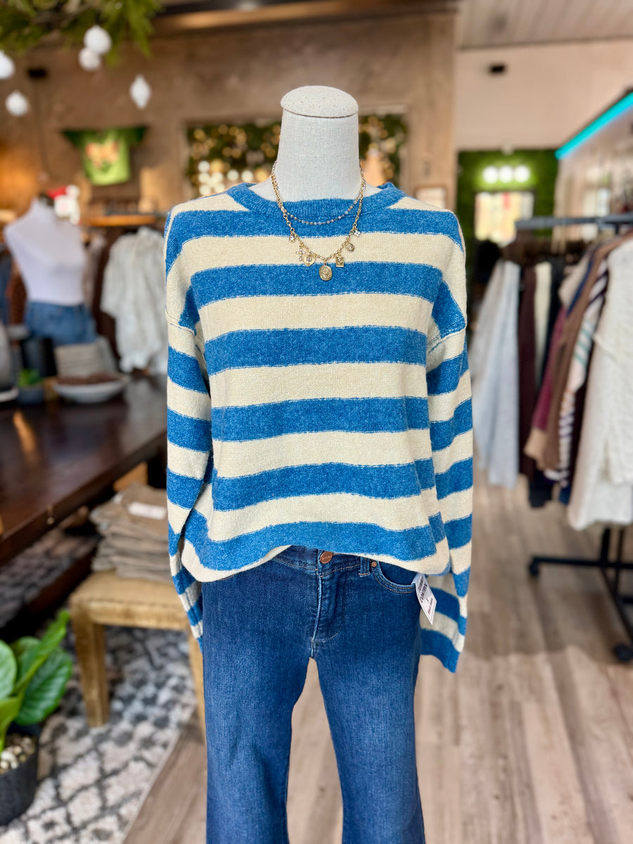 Stay cozy and stylish with our 55300 pullover sweater, now available in blue, gray, or tan stripe. Perfect for any occasion, this sweater will keep you warm and looking great.