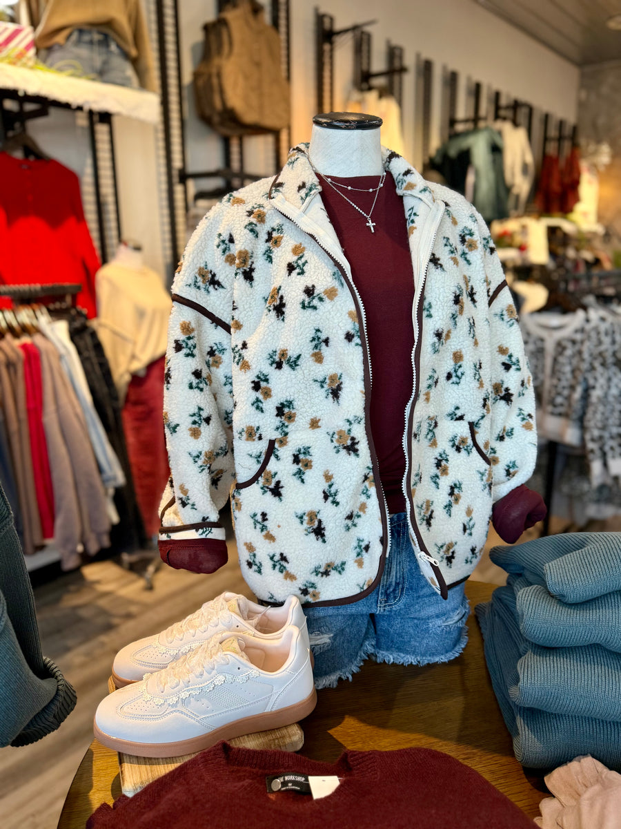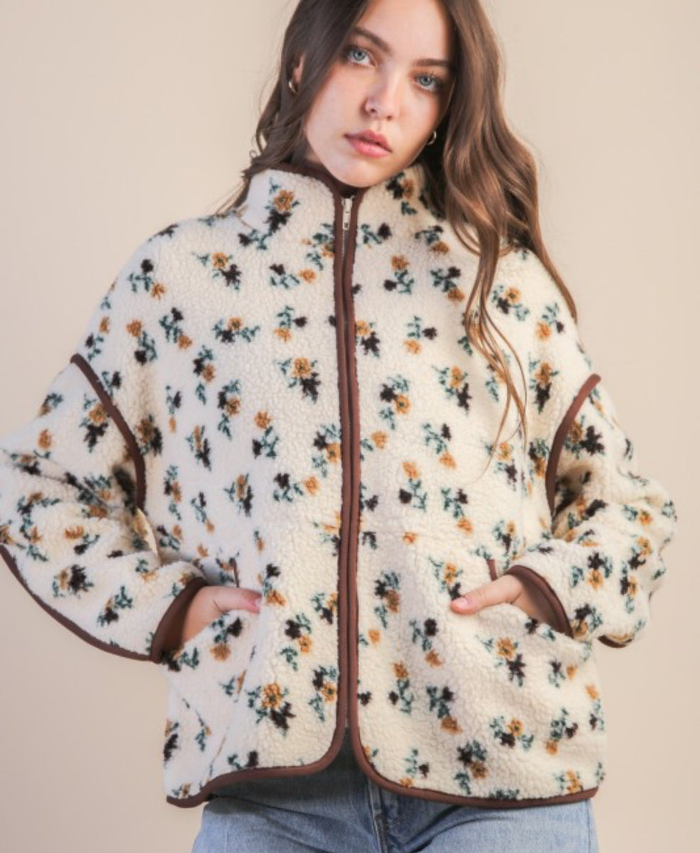 Stay cozy and stylish with our Sherpa floral button up jacket. Perfect for chilly days, this jacket features soft Sherpa lining to keep you warm and a stylish floral design for a touch of elegance. Look and feel your best with our 90431 jacket.