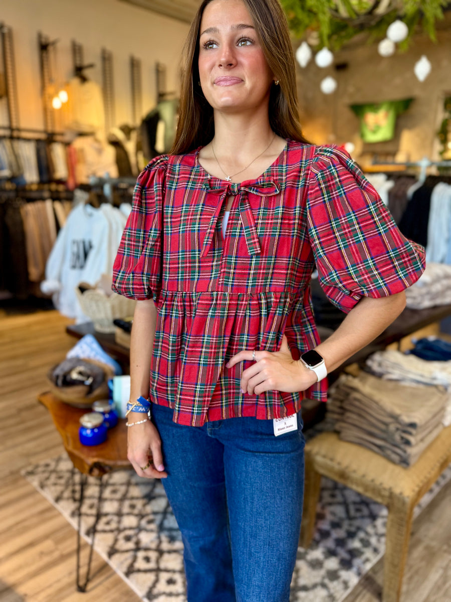 Effortlessly chic, the 9629 babydoll top features a festive red Christmas plaid design and a front tie for a flattering fit. Made to fit true to size, this top is the perfect addition to your holiday wardrobe.