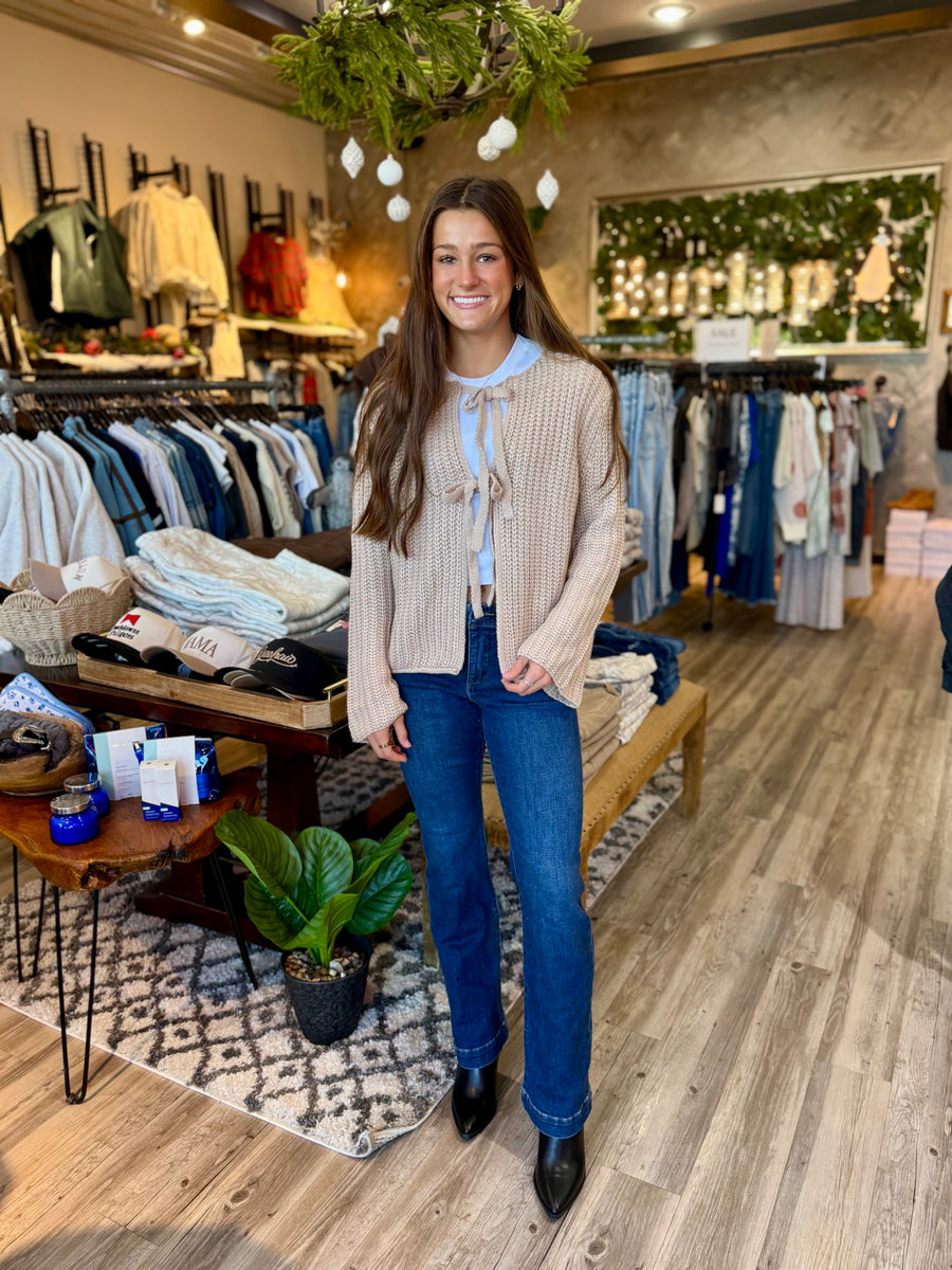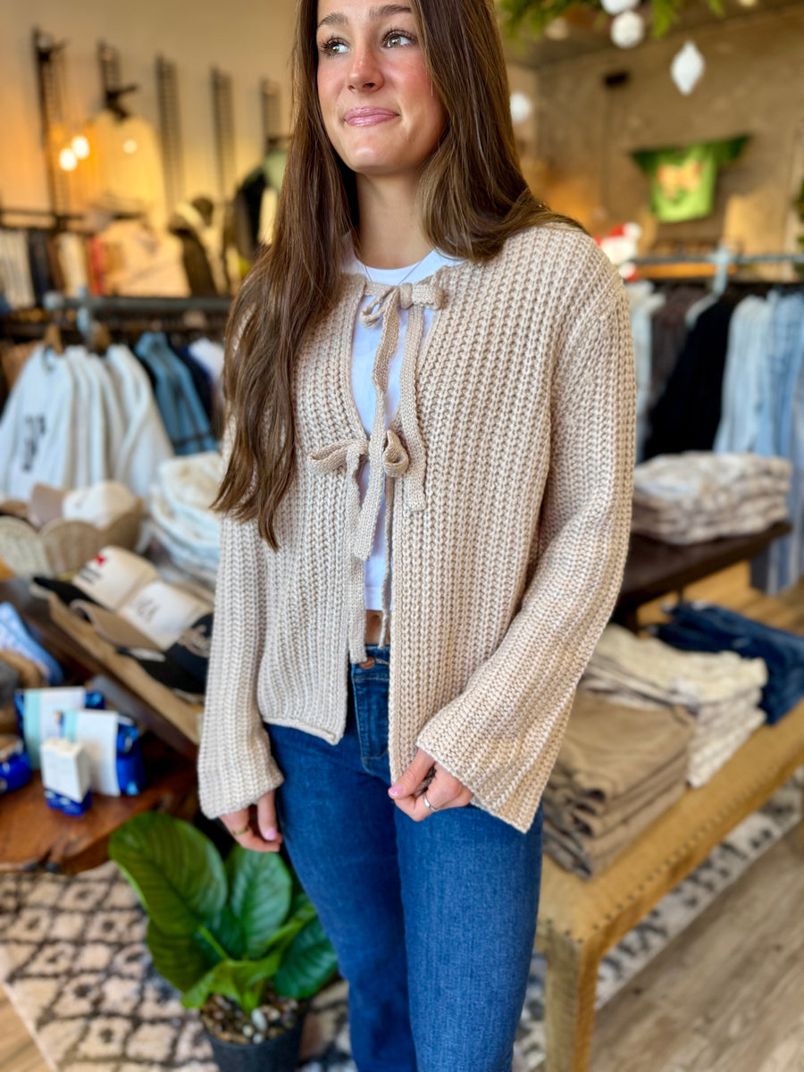Stay cozy and stylish with our Oatmeal Tie cardigan. Featuring a chunky knit design and front tie closure, this cardigan is the perfect addition to your wardrobe. Keep warm while looking effortlessly chic.