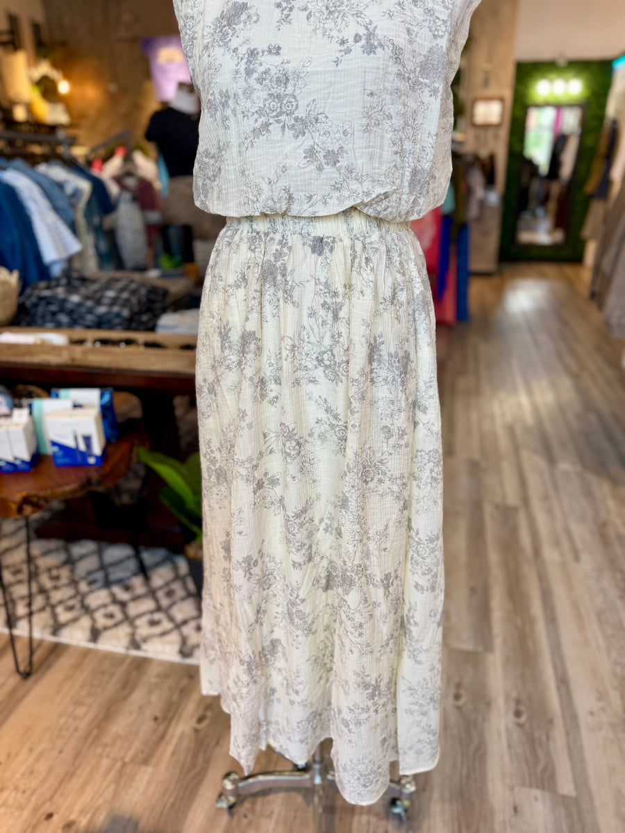 Cream floral ruffle waist midi skirt. See matching top 1002-t. Fits true to size.