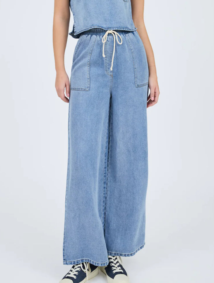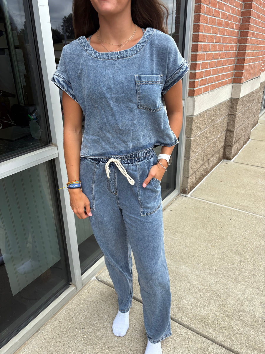 Get ready to rock the denim look with our 1032-b pants! Made from comfy chambray and featuring an elastic waist, these pants are perfect for any casual occasion. And they pair perfectly with our 1032-t top (sold separately)!