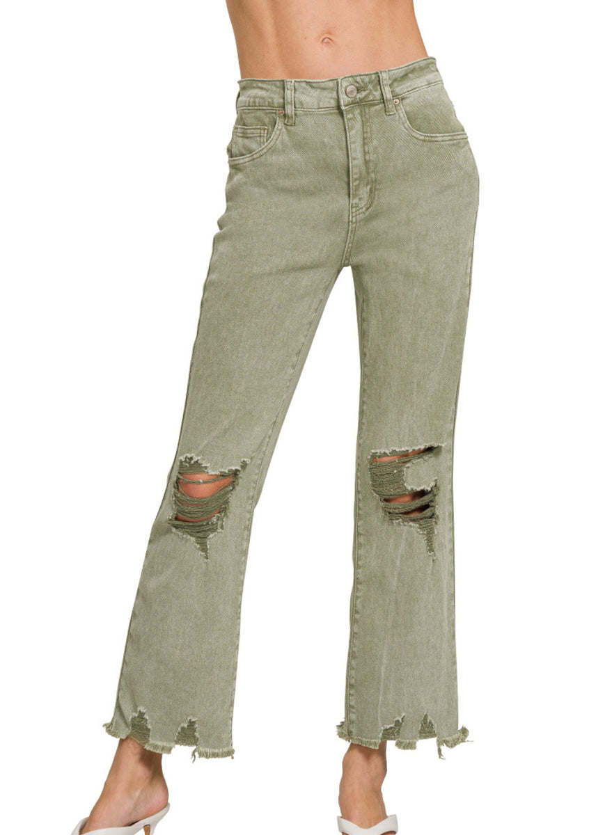 Effortlessly achieve a cool and edgy look with our 1857 jeans. These green distressed raw hem jeans add a touch of ruggedness to your outfit. With their unique color and stylishly frayed hem, you'll stand out from the crowd and make a fashion statement.