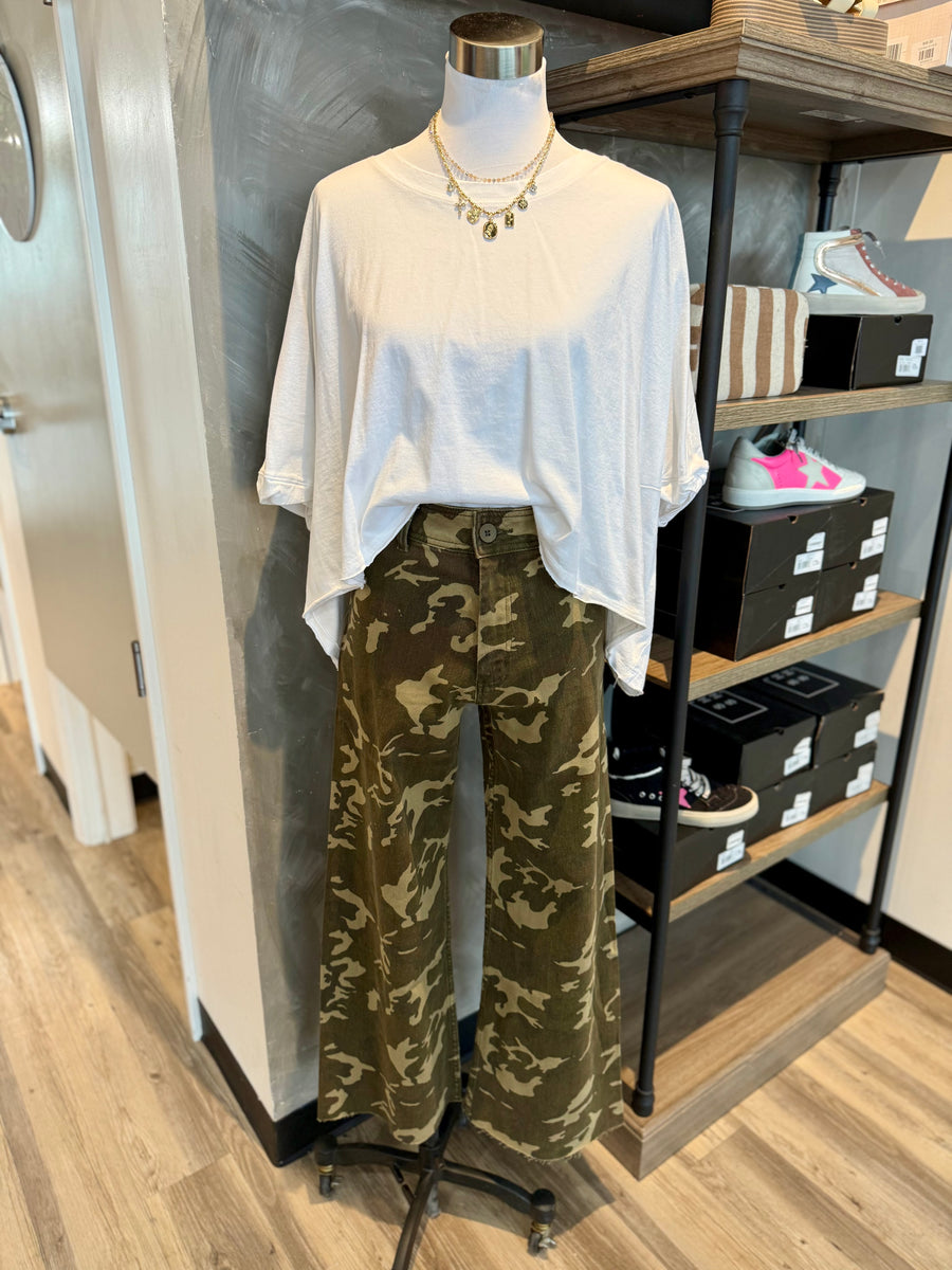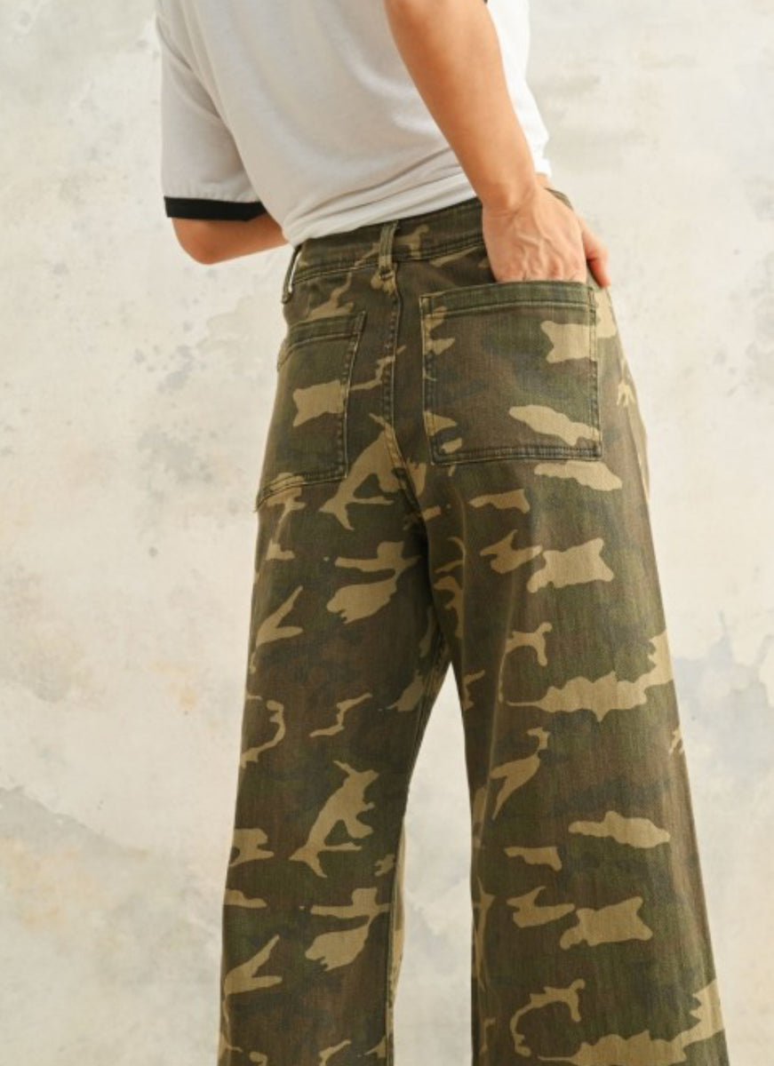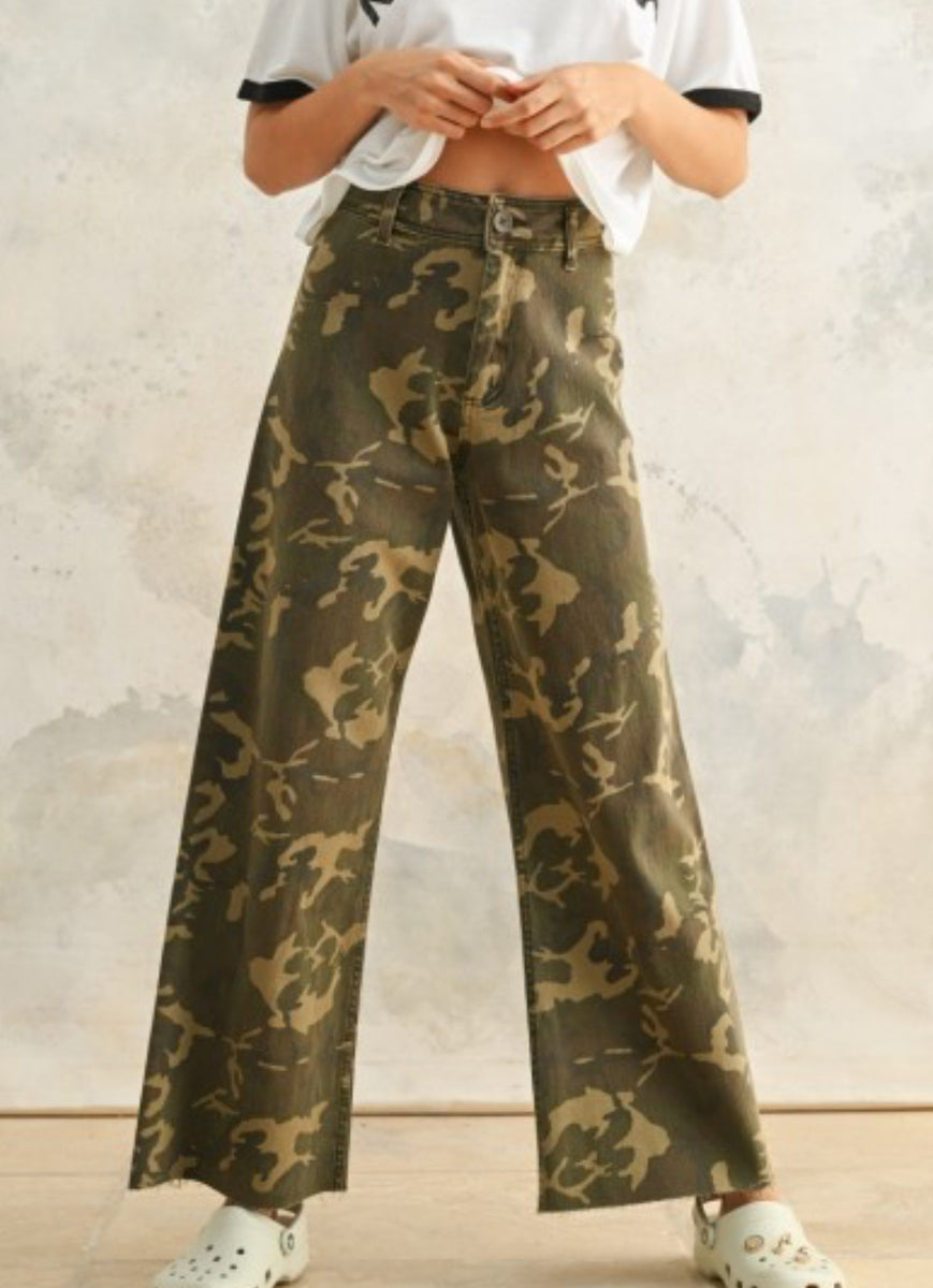 5415 is the perfect addition to anyone's wardrobe. These camo stretchy wide leg pants offer both style and comfort, making them a versatile piece for any occasion. Stay on-trend with these must-have pants in your closet.