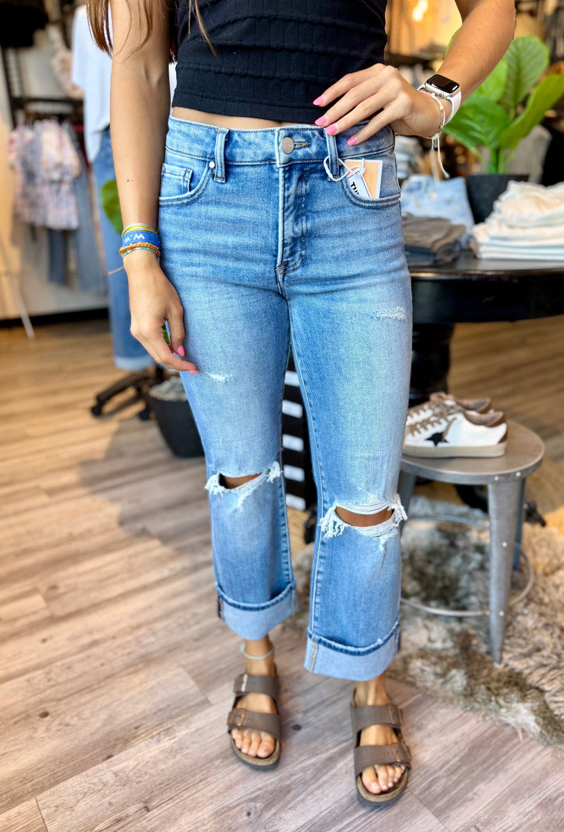 Introducing the Risen 5875 jeans. With a stretchy fit, these medium wash crop straight jeans from Risen offer both comfort and style. The perfect addition to your wardrobe for a flattering and versatile look.