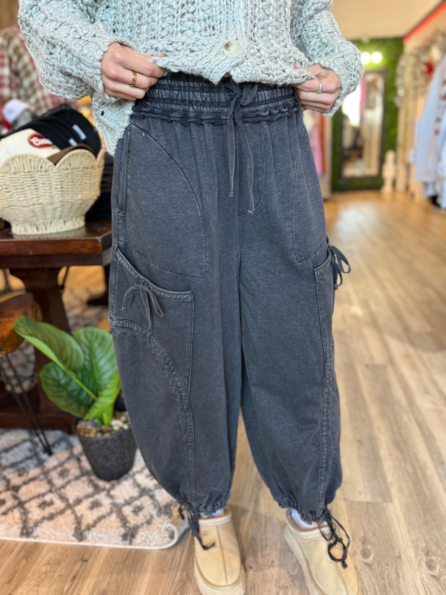 These black loose fit pants feature ties and are inspired by free-spirited fashion from Free People. With a relaxed fit, they're comfortable and stylish for any occasion.
