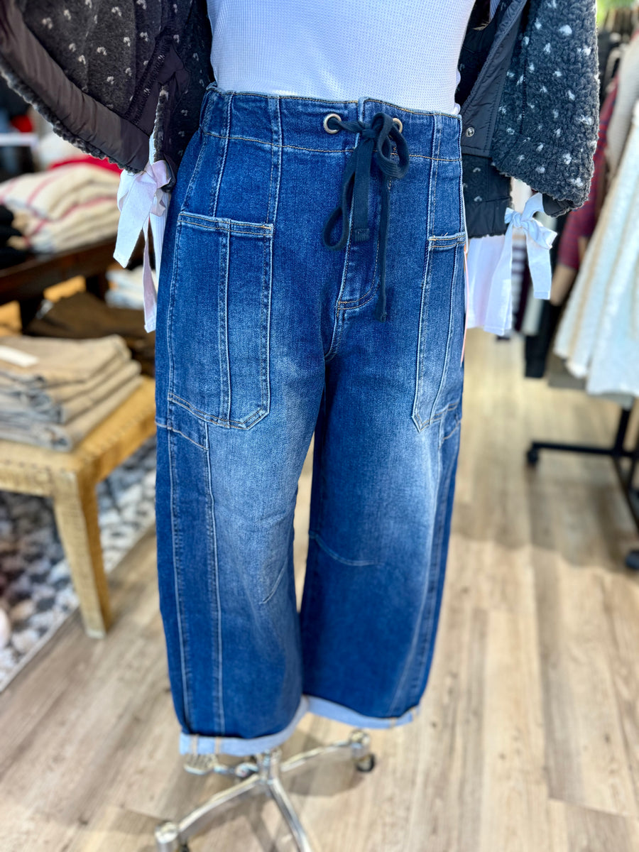 Upgrade your denim game with our Barrel cargo jeans. Available in dark denim or black, these high rise crop cuffed jeans feature a tie waist and relaxed fit for ultimate comfort. With a 14.5” rise and 26” inseam (28.5” without cuff), these jeans are a stylish and versatile addition to your wardrobe.