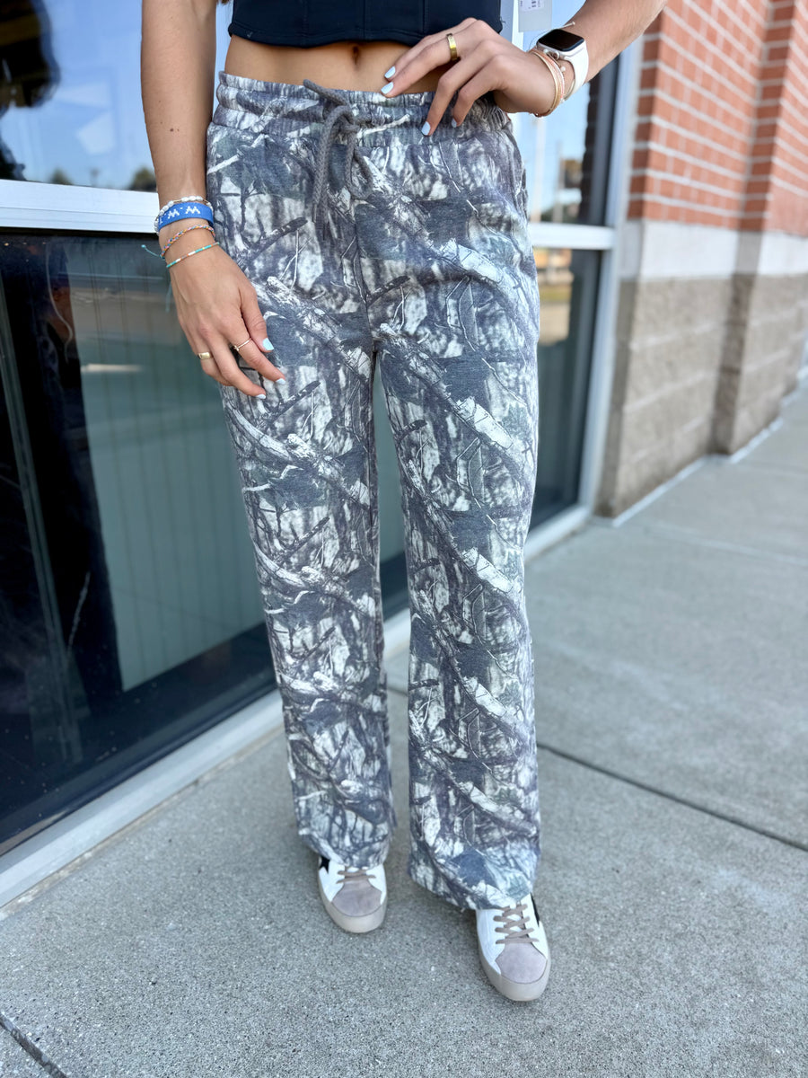 Camouflage relaxed sweatpants. Available in two color options with an elastic waist and drawstring. Fits true to size.