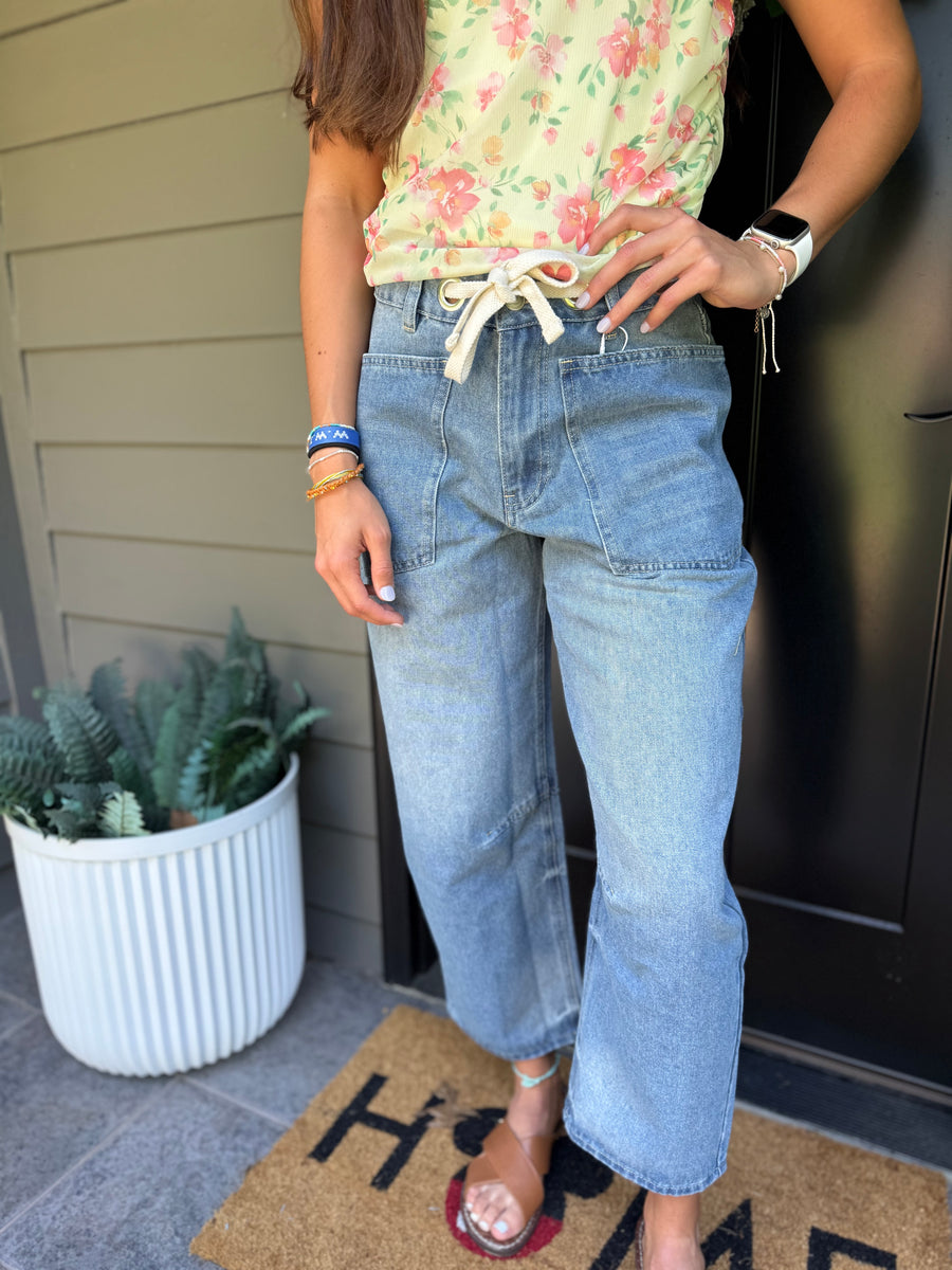 "These Indigo barrel jeans have a playful tie waist and a light wash that fits true to size. Get ready to turn heads and be comfortable all day long!"