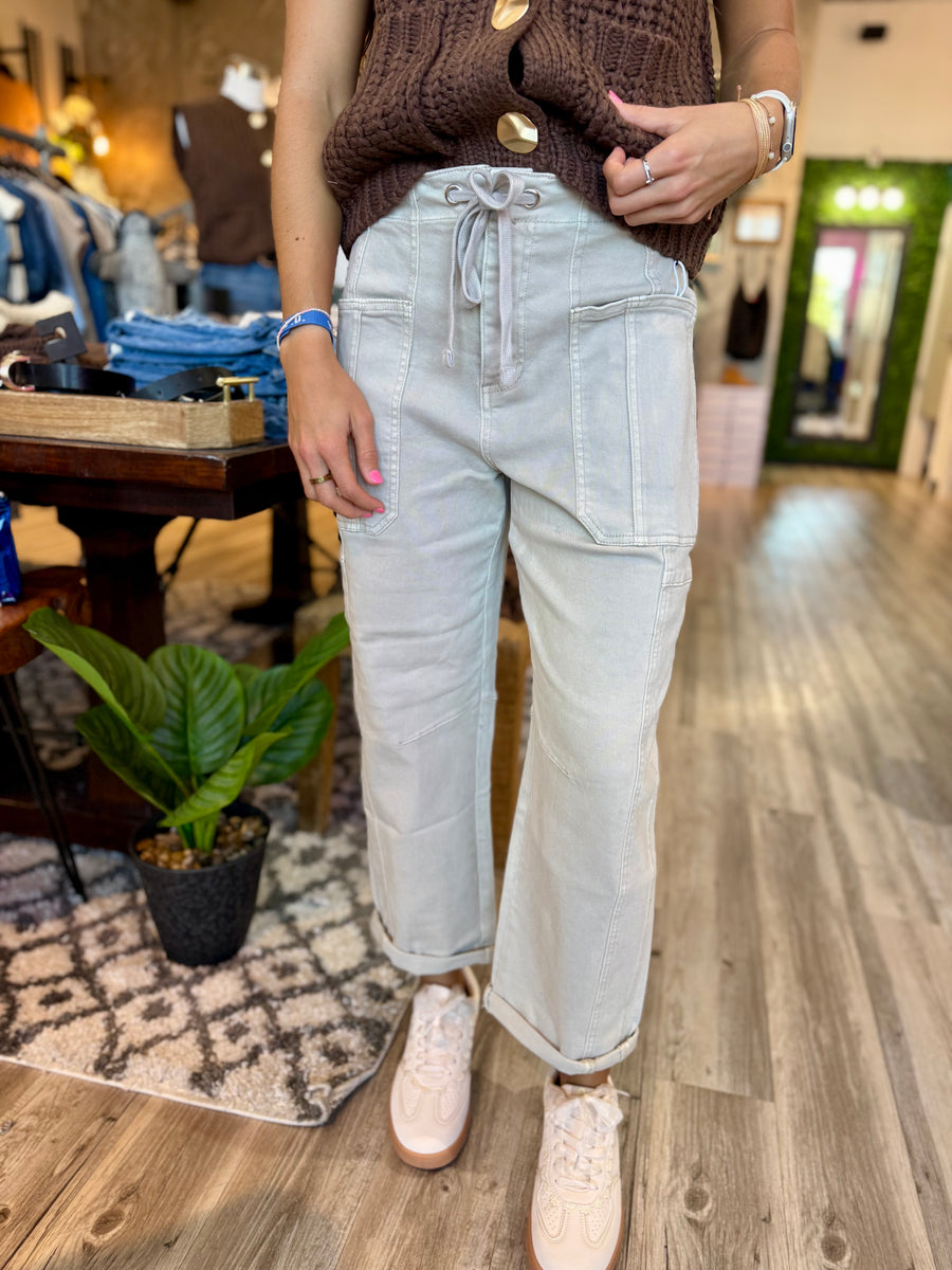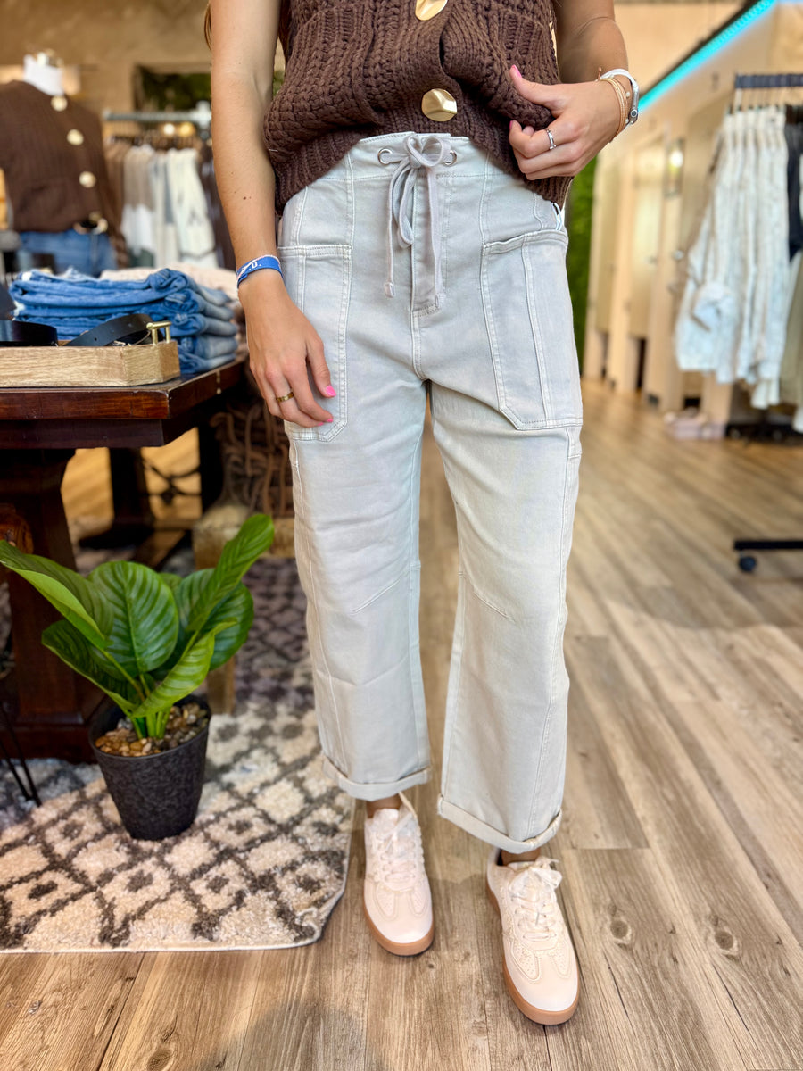 Stay comfortably stylish in our Tan high rise cuffed wide barrel cargo pants with drawstring. The relaxed fit and 12" rise provide the perfect amount of comfort and support, while the 25" inseam with cuff and 27.5" without cuff allow for versatile styling options. Perfect for any occasion.