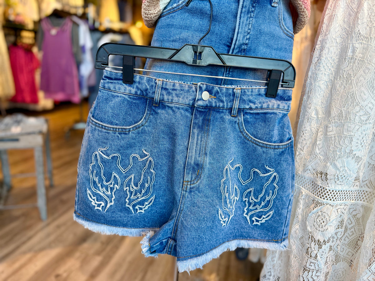 Saddle up in these playful Western shorts! With Western stitched details and an elastic back, these jean shorts fit true to size for maximum comfort. Yeehaw!