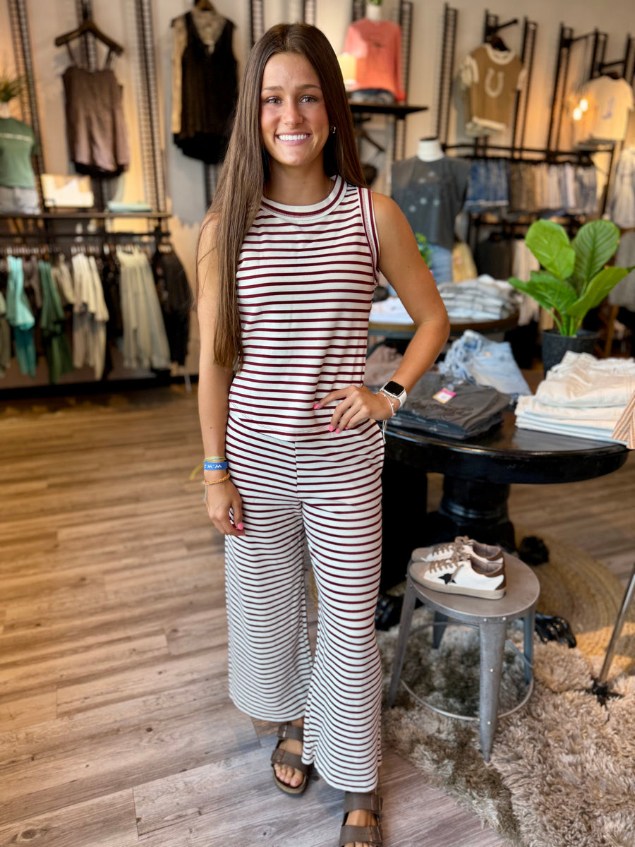 Effortlessly stylish and comfortable, our Wine Stripe Pants feature a flattering vertical stripe design and convenient pockets. Made to fit true to size, these pants pair perfectly with our matching tank for a complete and chic look. Upgrade your wardrobe with these versatile and fashionable pants today.