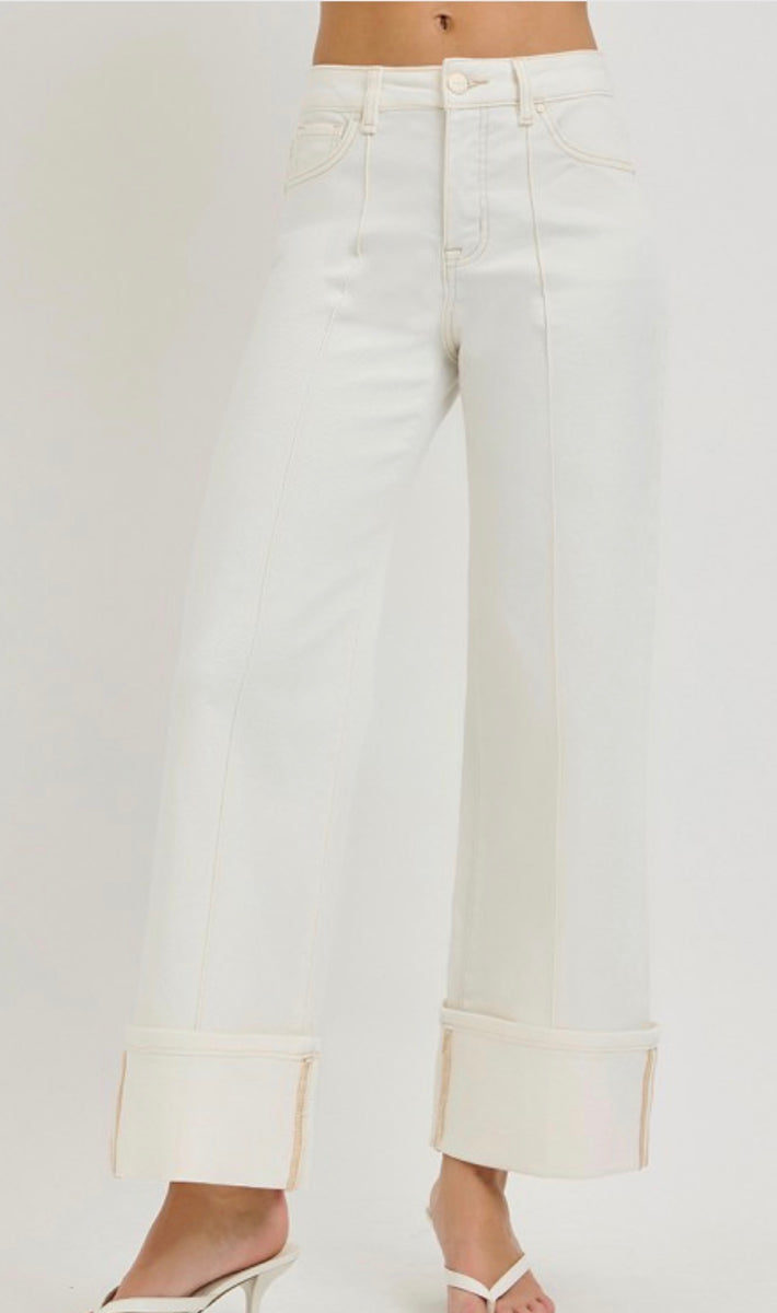 Elevate your style with the 21662 Cream Tummy Control High Rise Stretch Jeans. The wide-leg, cuffed design offers comfort and a flattering silhouette, while the tummy control feature enhances your natural shape. Perfect for a chic, casual look that keeps you feeling confident all day.