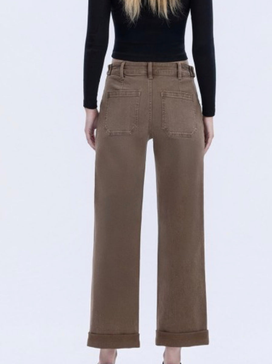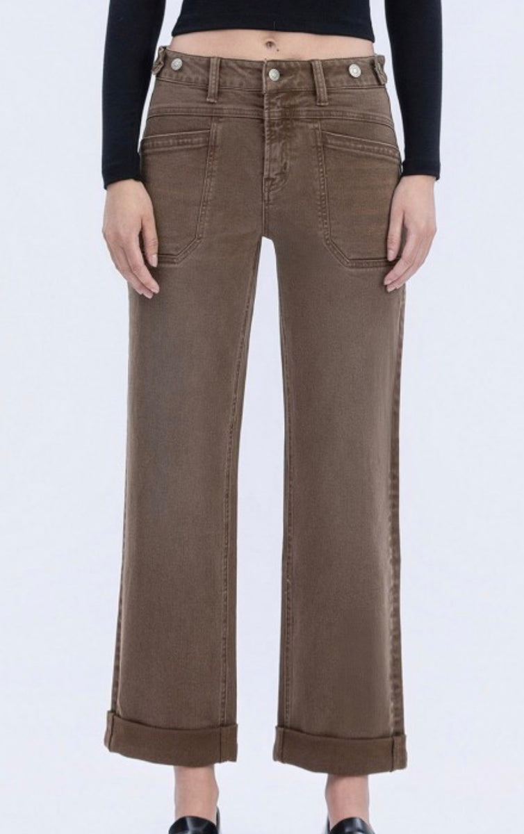 Upgrade your wardrobe with these Brown flying monkey high rise tabbed waistband puffed jeans. Made with 79% cotton, 20% lyocell, and 1% spandex, these jeans provide a comfortable and flattering fit with a 10.5” rise and 27” inseam. Elevate your style with ease.