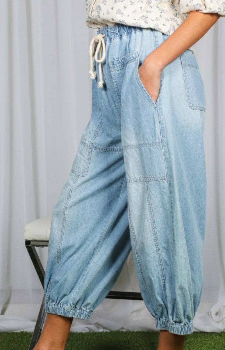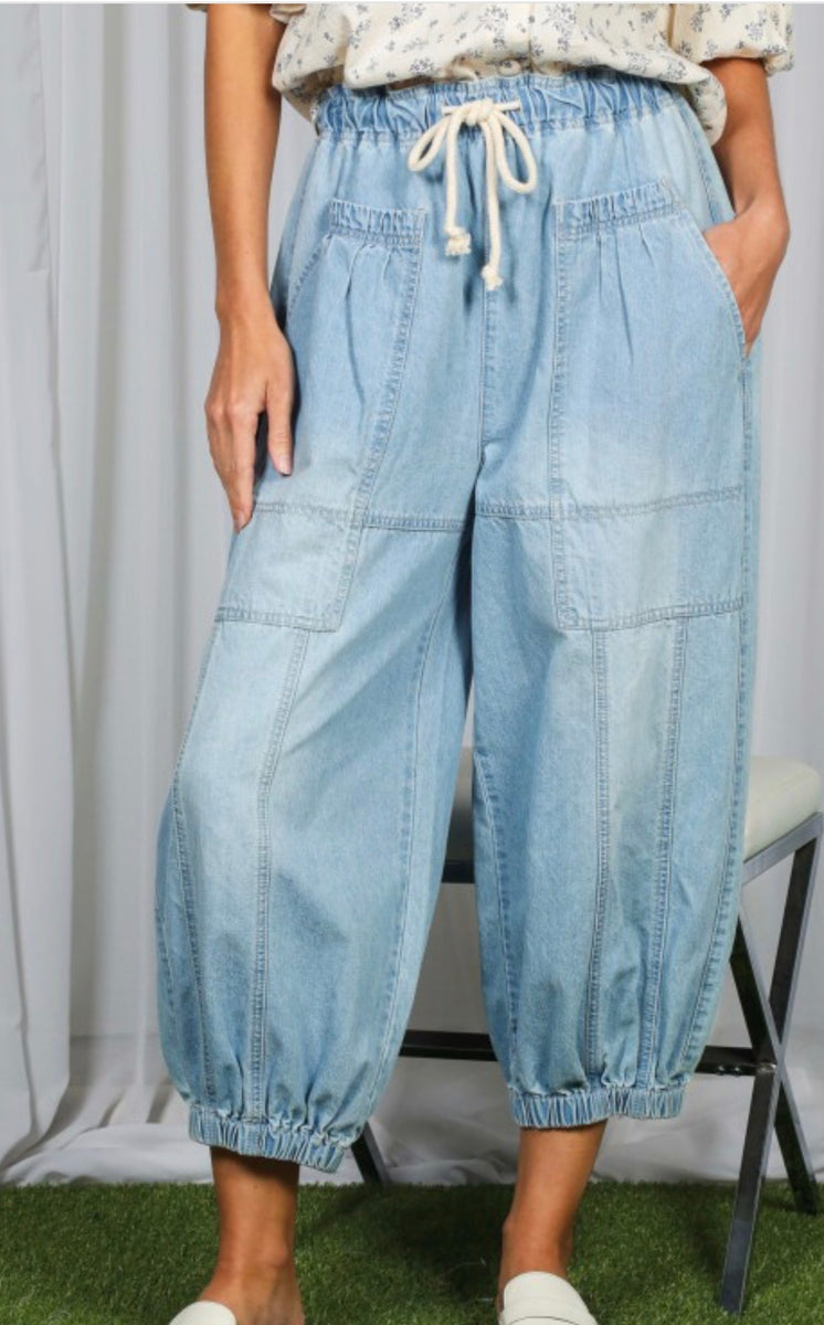 Introducing the 83238, lightweight denim barrel jeans designed for comfort. The elastic waist ensures a snug fit while allowing freedom of movement, making them perfect for everyday wear. Enjoy style without sacrificing ease in these versatile jeans.