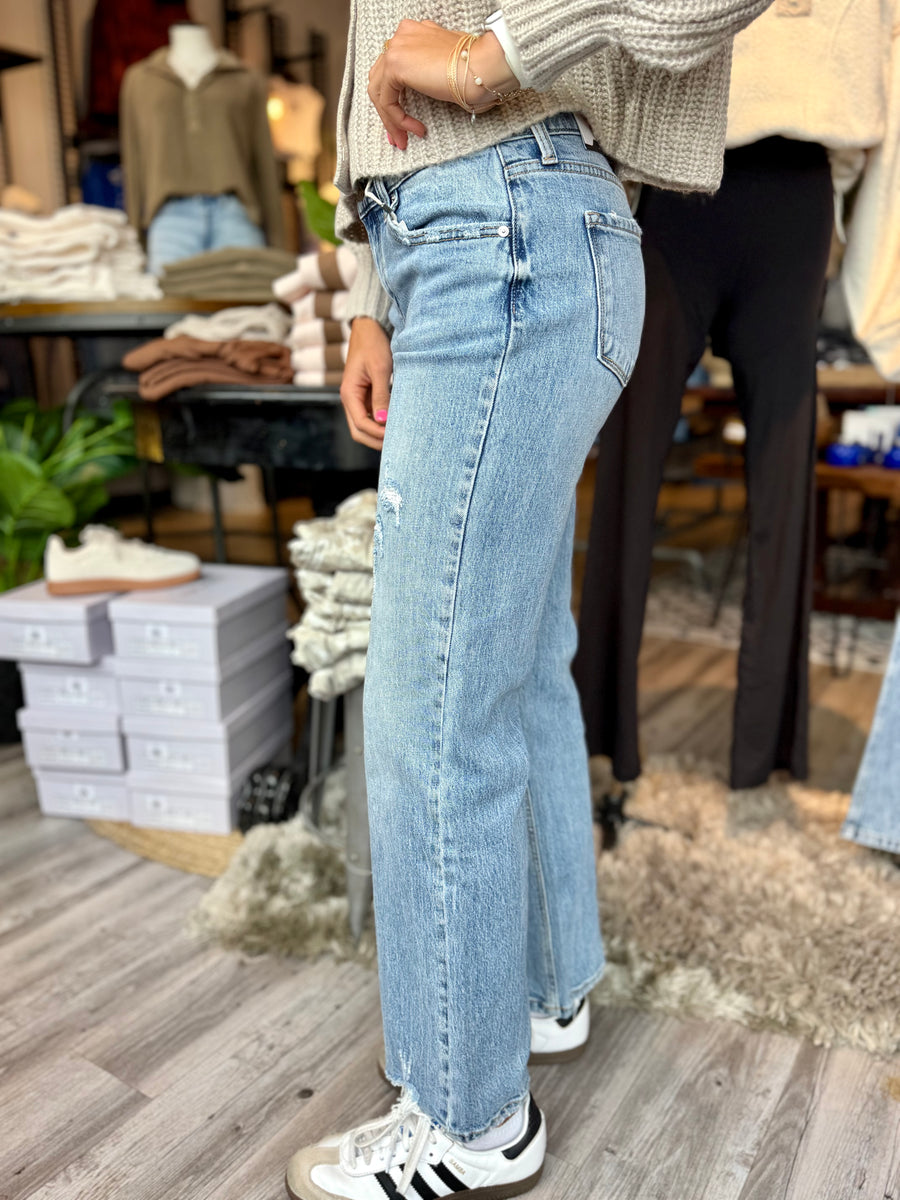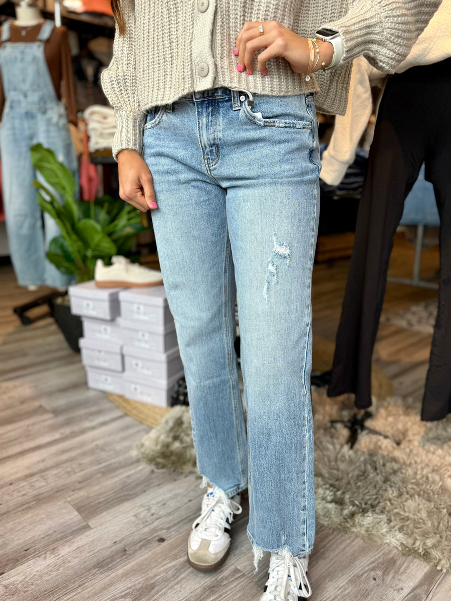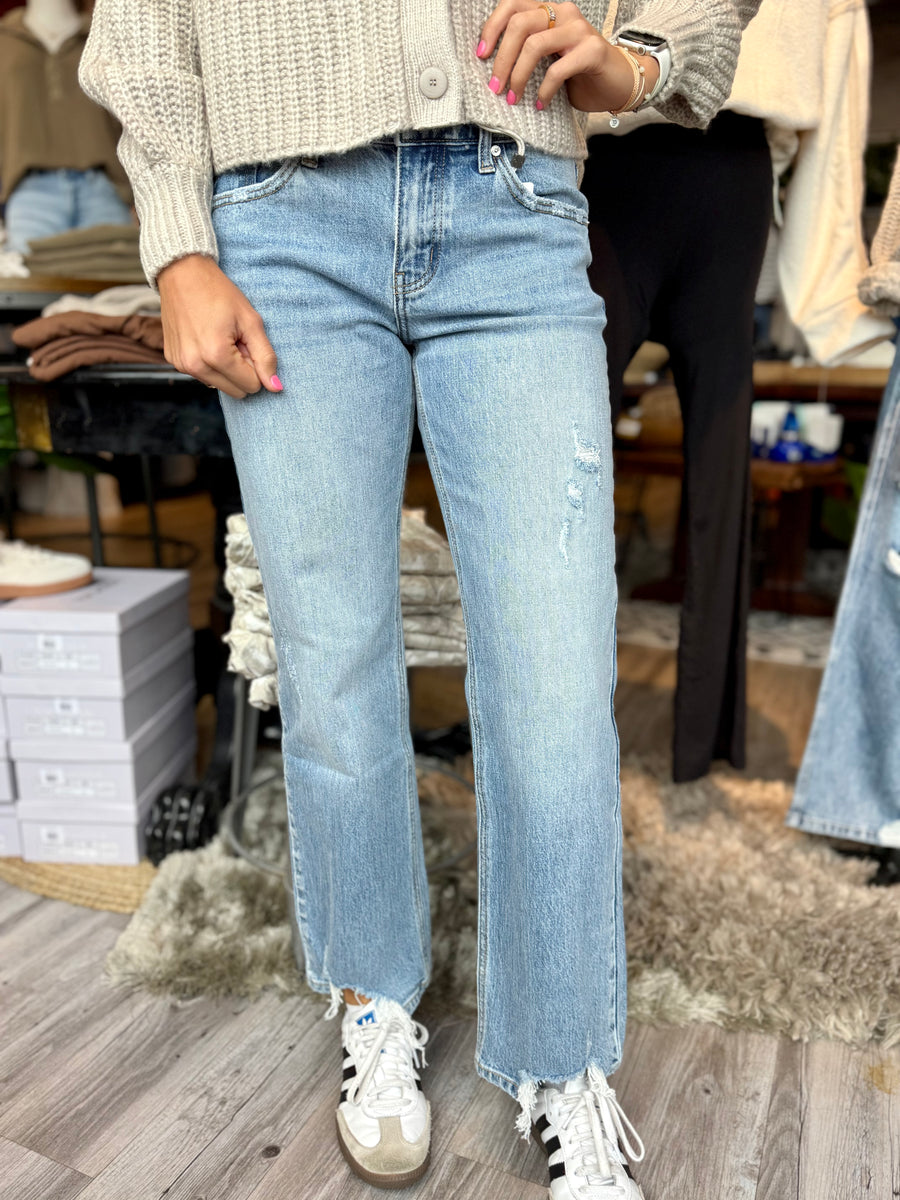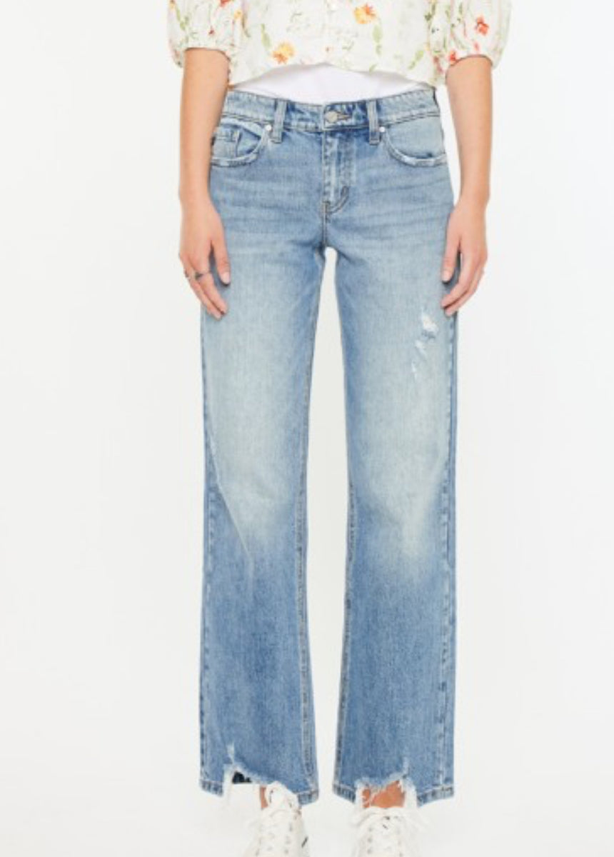 Introducing 9421, the perfect pair of Kancan brand mid rise true straight jeans. Made with no stretch, these jeans have a 9.5" rise and a 31" inseam for a comfortable and flattering fit. Upgrade your wardrobe with these timeless jeans.