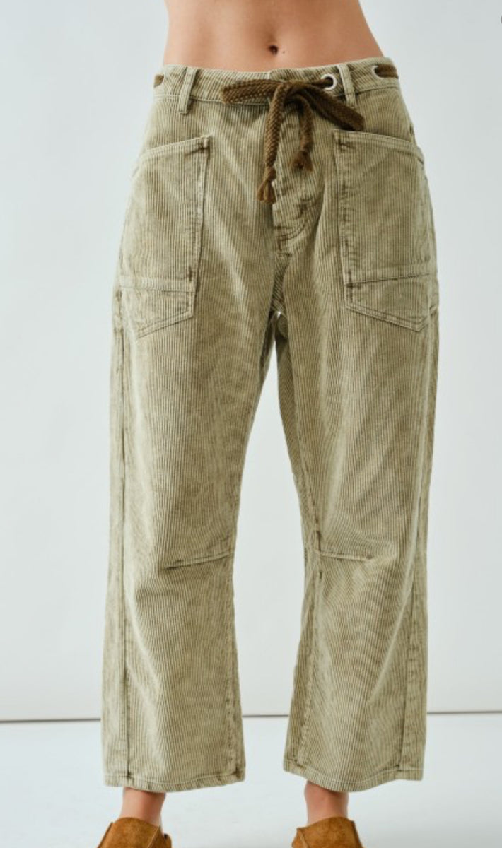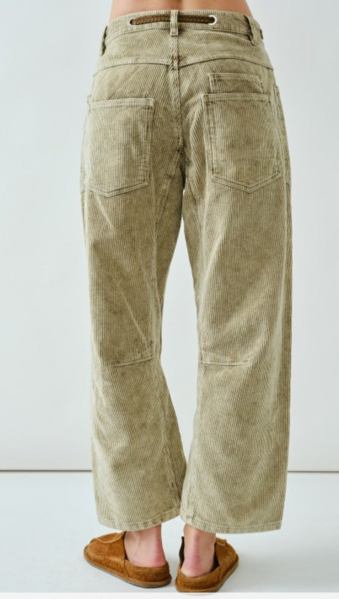 Upgrade your wardrobe with our light olive green corduroy barrel drawstring pants. Crafted from soft corduroy, these pants offer a comfortable fit and stylish look. Perfect for any casual occasions, these pants are a must-have for any fashion-forward individual.