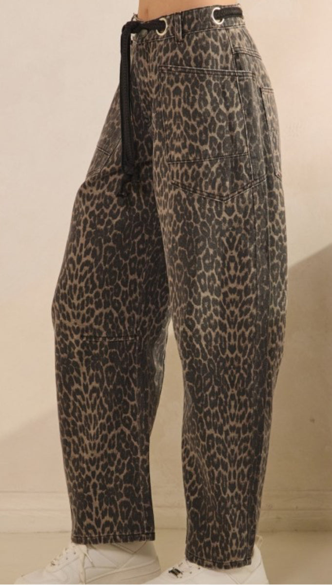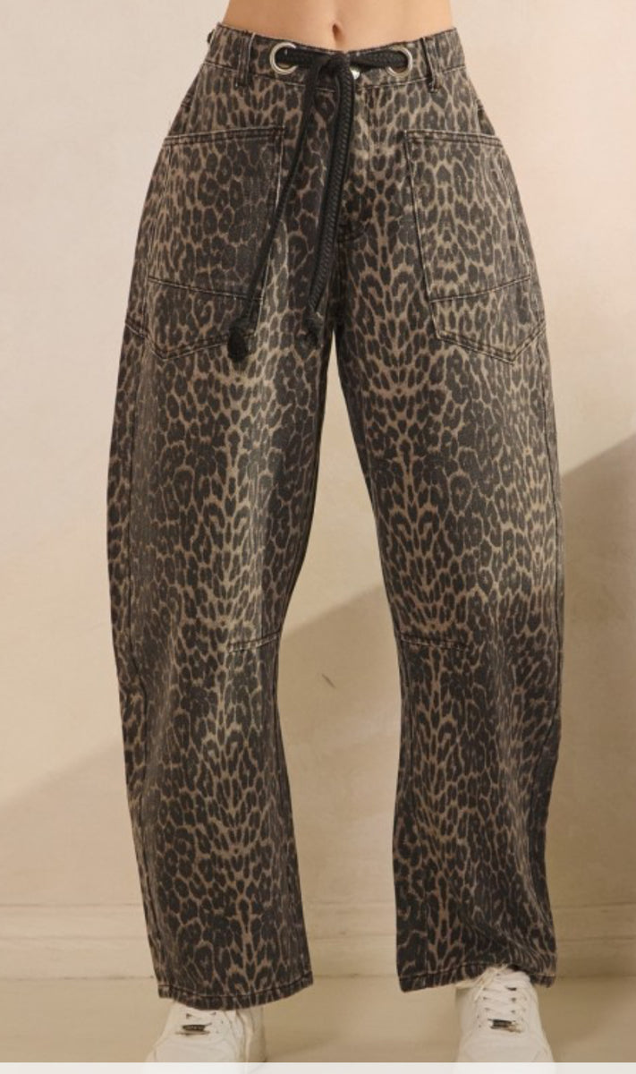 Effortlessly stylish and comfortable, our 72435 leopard barrel tie waist jeans are a must-have addition to your wardrobe. The trendy leopard print adds a touch of sophistication to any outfit, while the tie waist provides a flattering and adjustable fit. Elevate your fashion game with these versatile jeans.