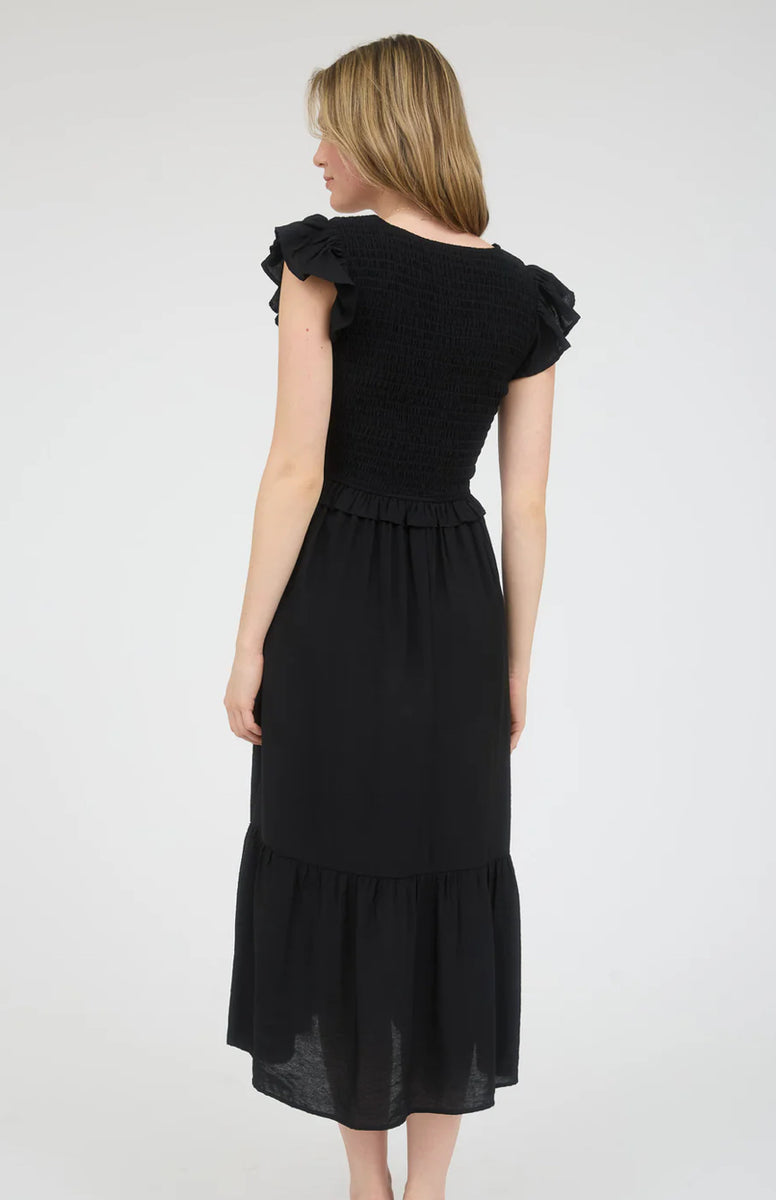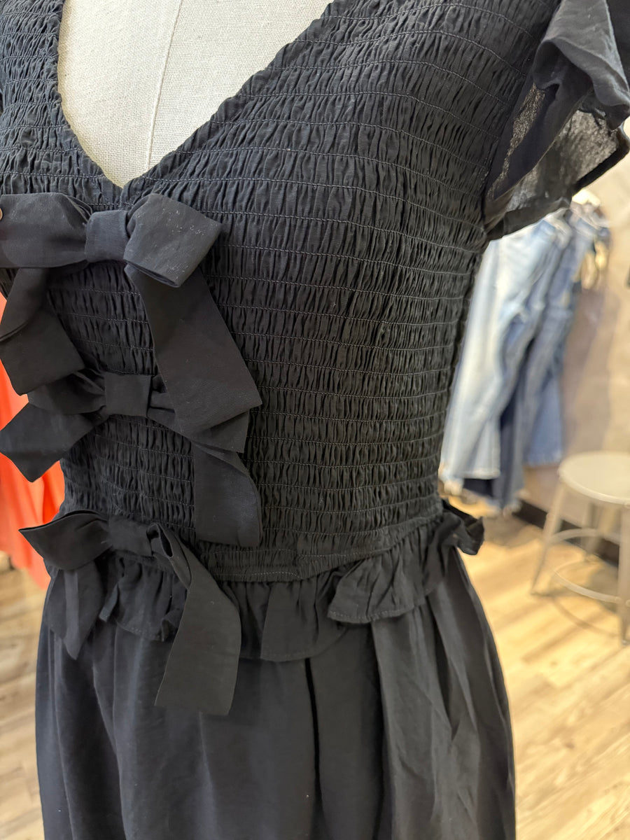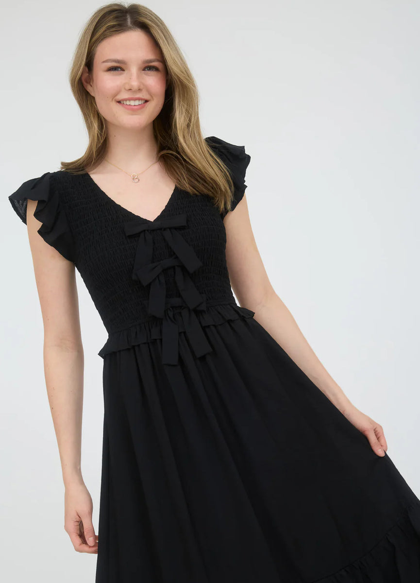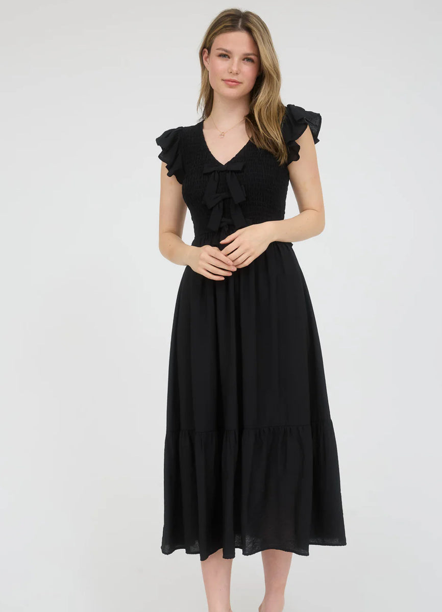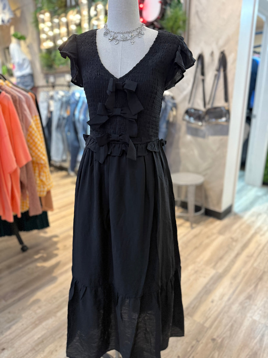 Introducing our 2593 bow dress - the perfect blend of elegance and whimsy. This black midi maxi dress features unique front bow details and fits true to size for a flattering look. Add a touch of playful charm to your wardrobe with this dress!