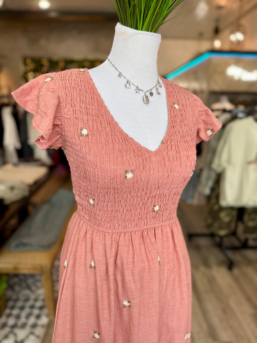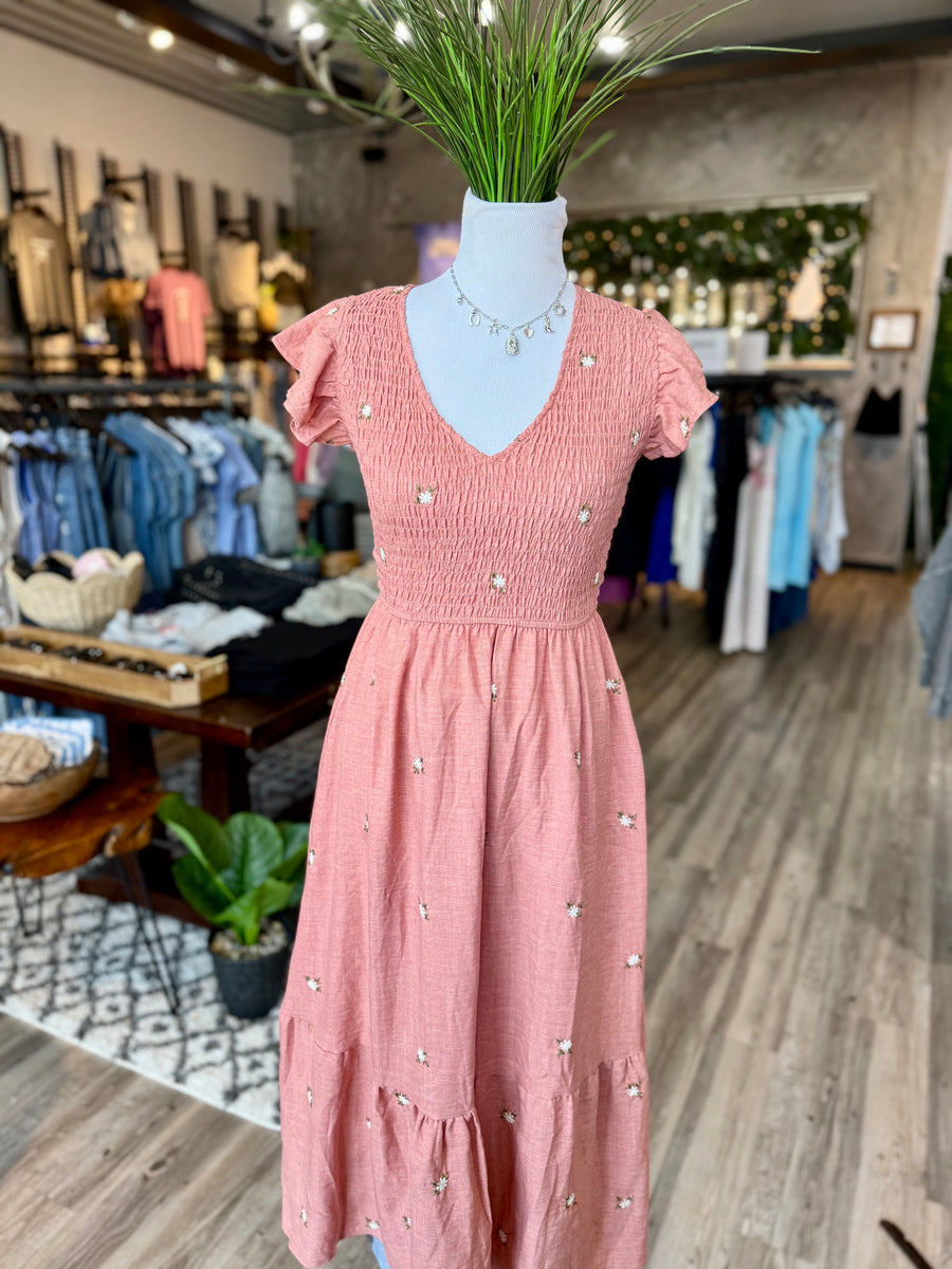 Crafted with the perfect blend of mauve pink and floral embroidery, the 2606 maxi dress is a must-have for any wardrobe. Its smocked design ensures a perfect and comfortable fit, making it an ideal choice for any occasion. Dress it up or down, this dress will always fit true to size.