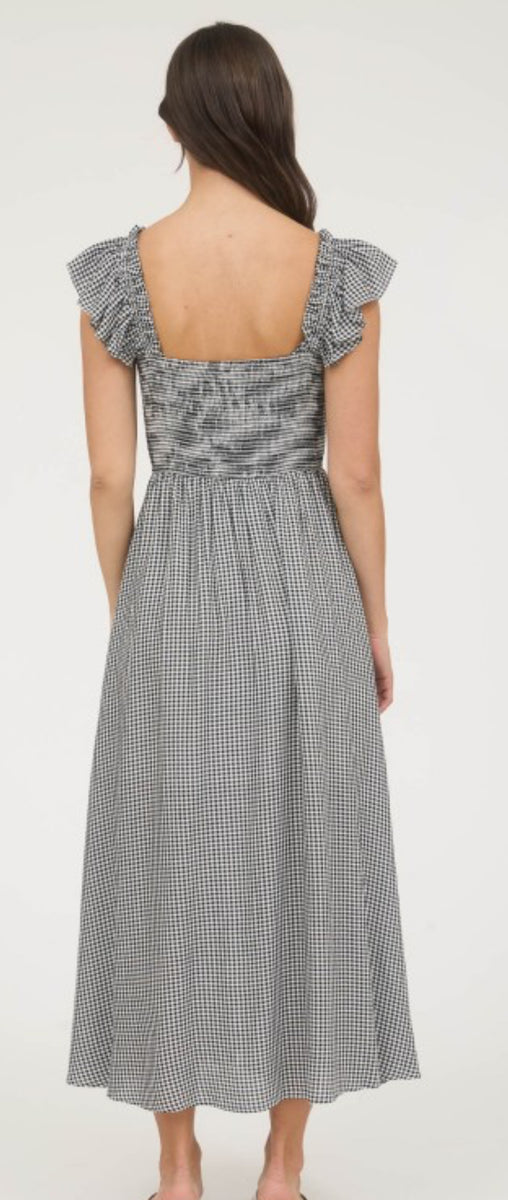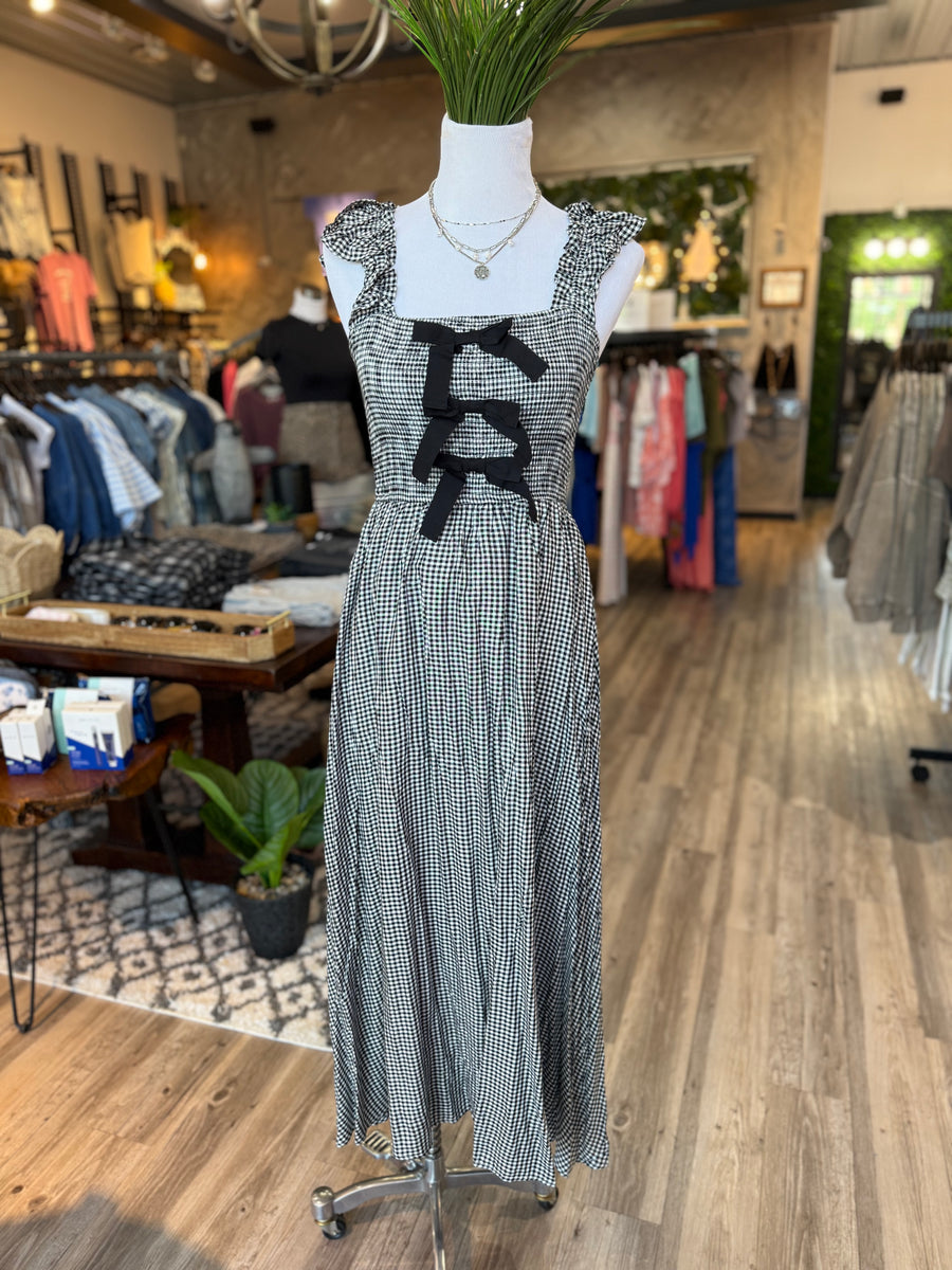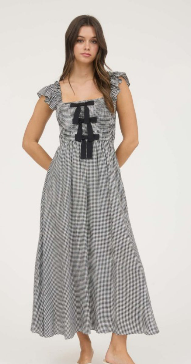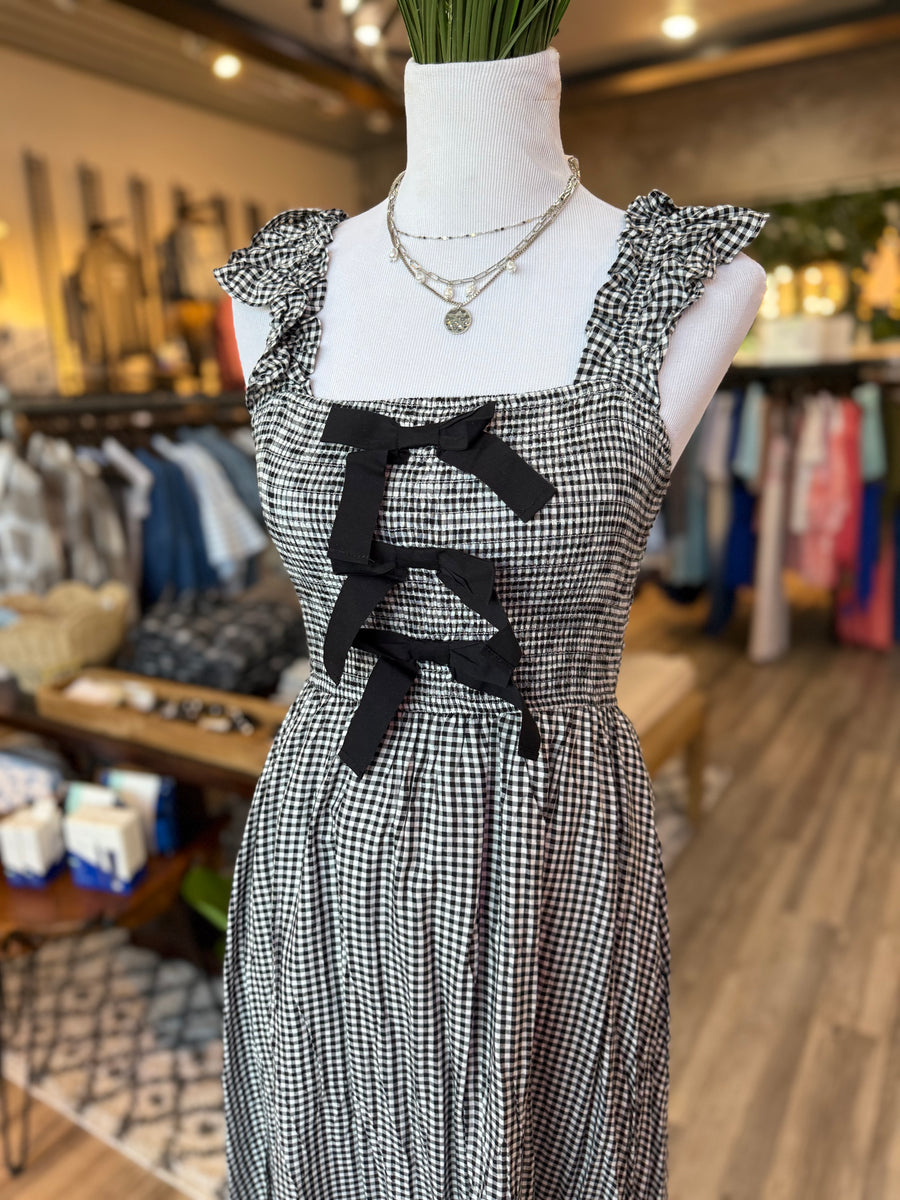 Elevate your style with our Black Gingham Front Bow Maxi Dress. This charming piece features a stunning front bow detail and timeless black gingham pattern, perfect for any occasion. Stay effortlessly chic and comfortable all day long. Own the look today.