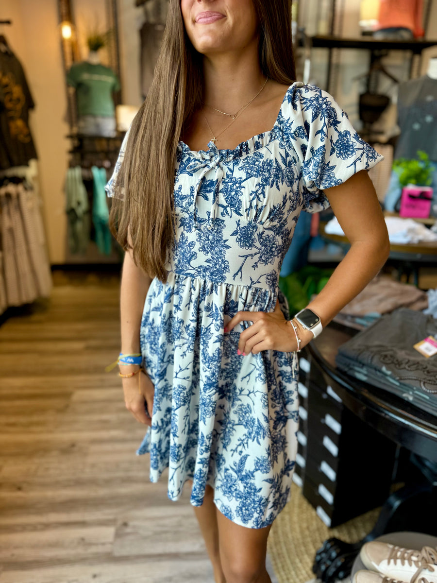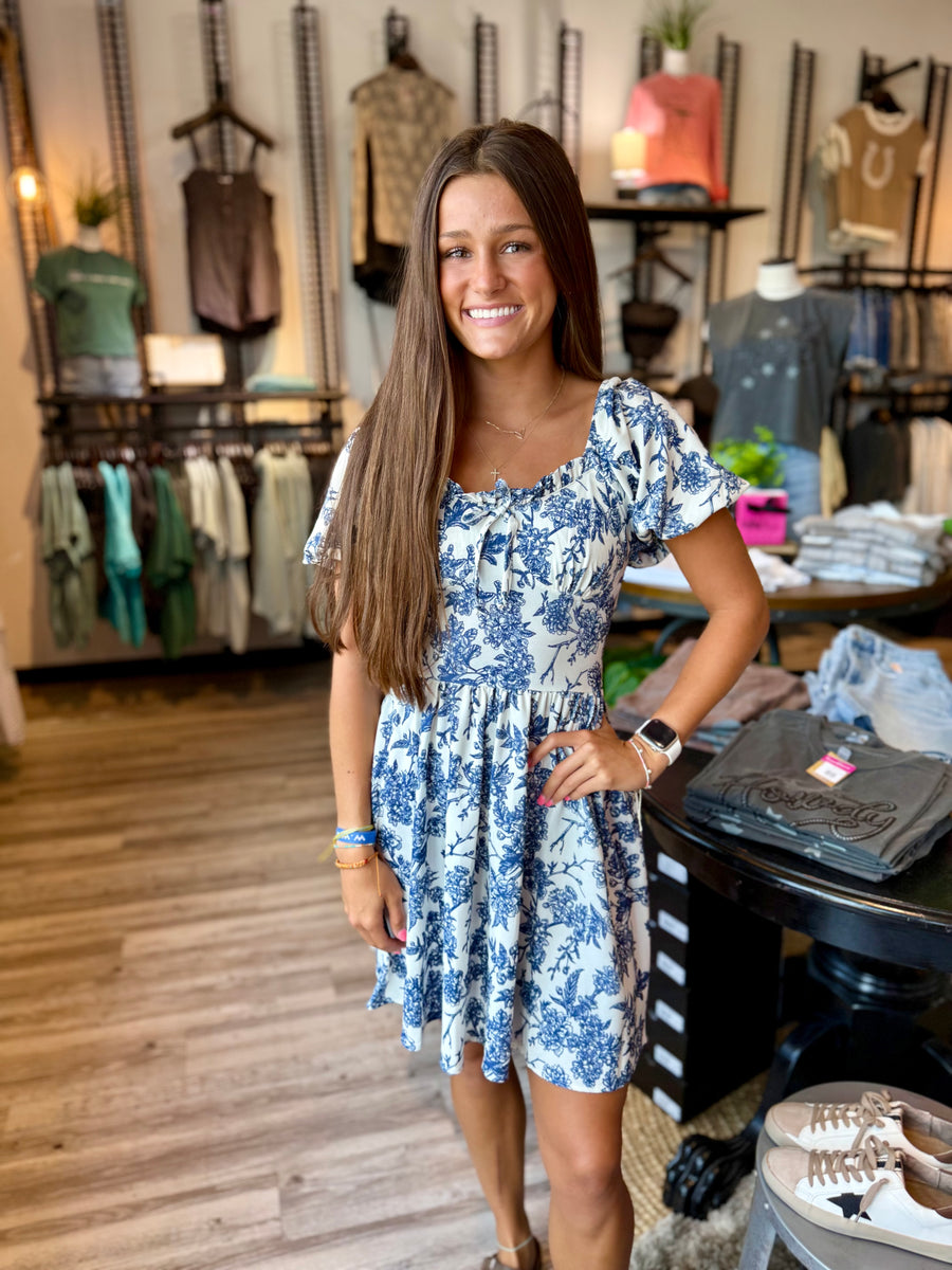 Effortlessly elegant. 1051 is a versatile ivory and navy floral print dress with pockets. A perfect blend of style and convenience, it's sure to elevate your wardrobe.