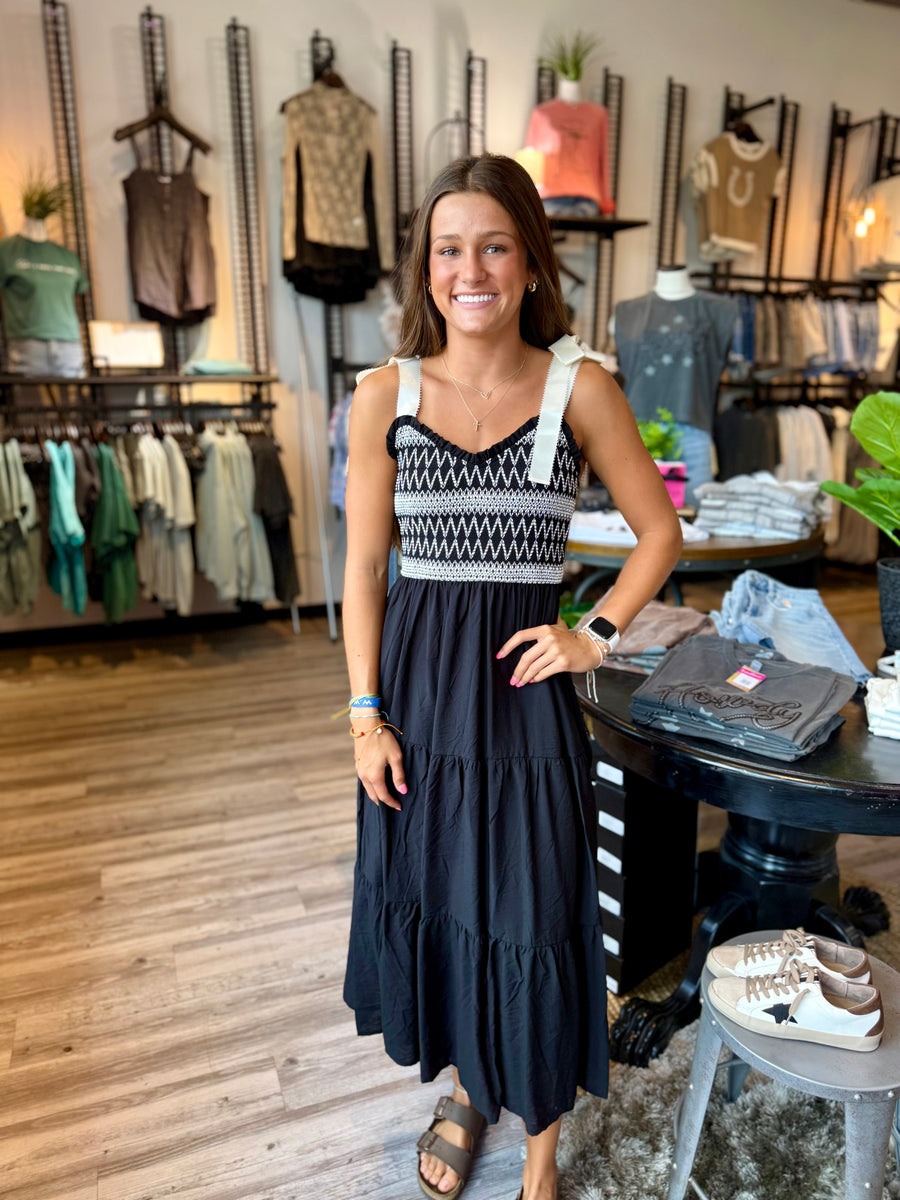 Get ready to turn heads in the 2570 maxi dress! This playful black and white dress features a ribbon tie detail and tiered design. It's true to size, so you'll get the perfect fit. Stand out from the crowd with this fun and stylish dress.