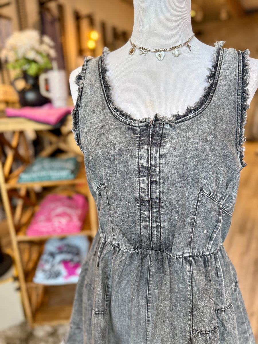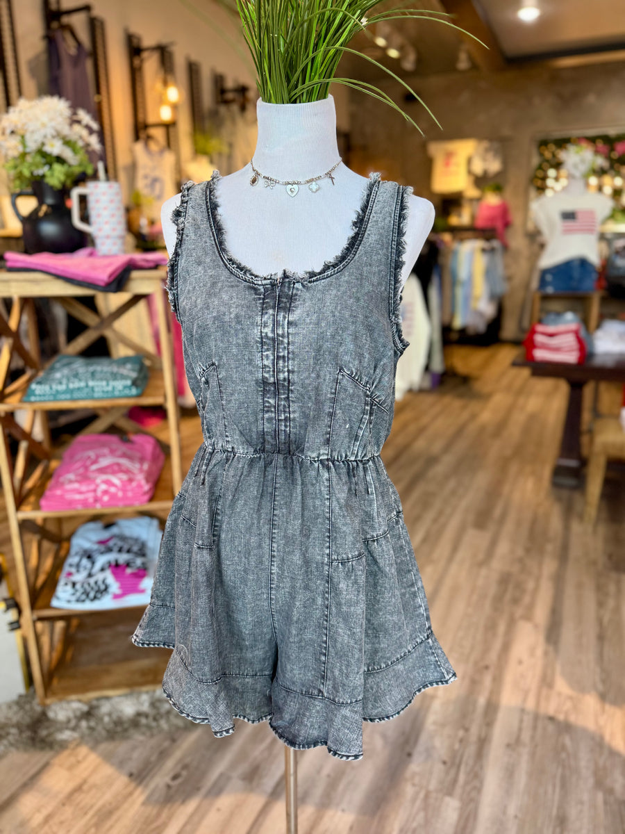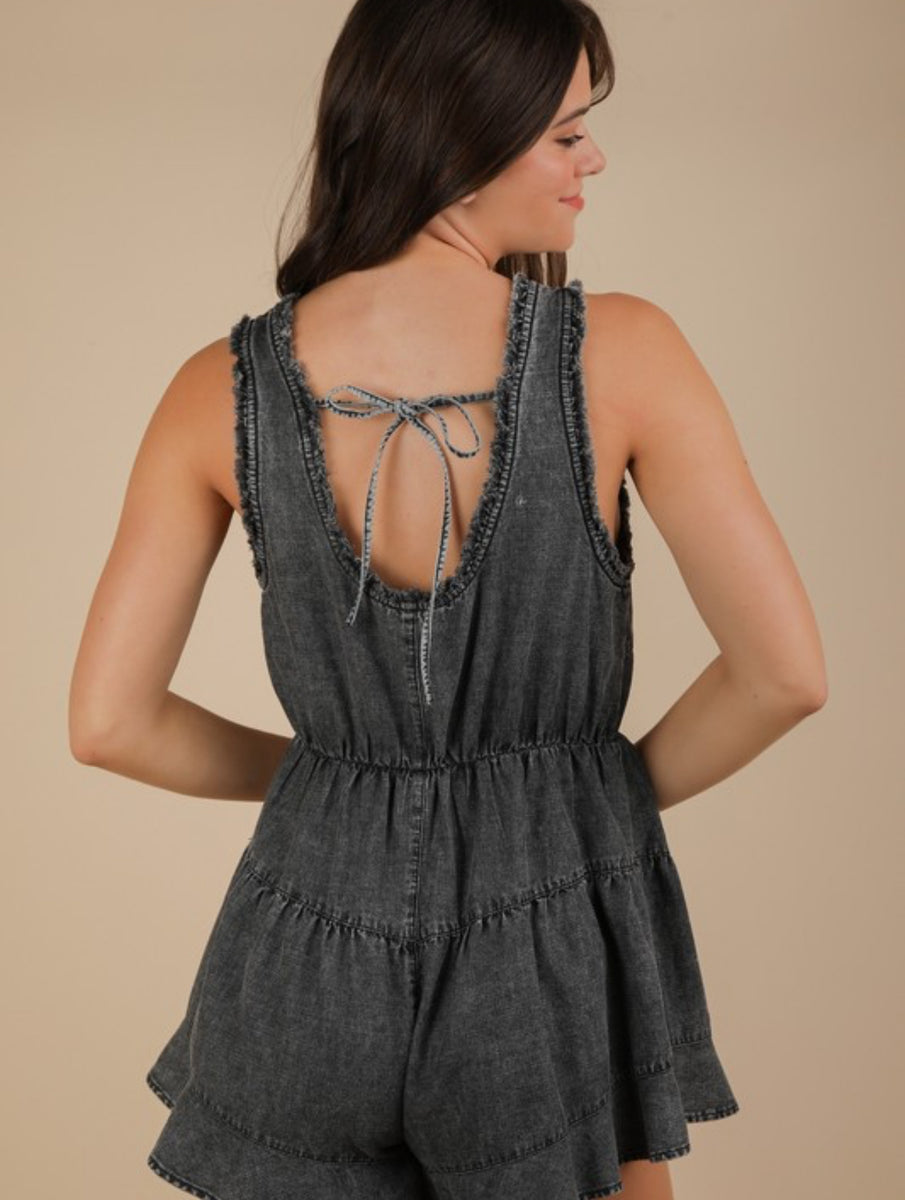 The Black Denim Romper: a playful and stylish addition to your wardrobe. This romper features a ruffled black chambray bodice and black denim shorts that fit true to size. Perfect for a casual yet chic look, this romper will surely become your go-to outfit for any occasion.