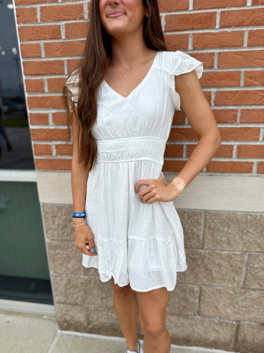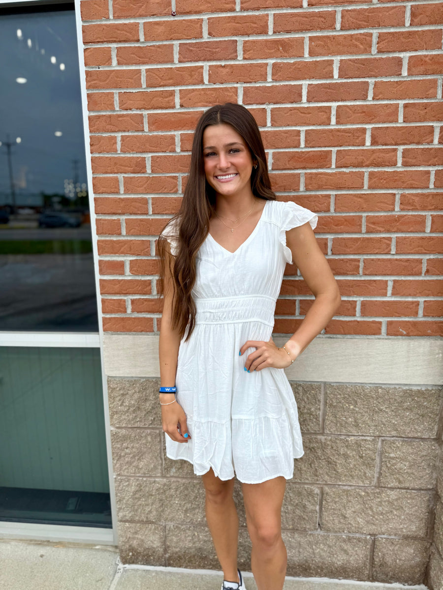 White v neck short sleeve ruffle detail dress.  Fits true to size.