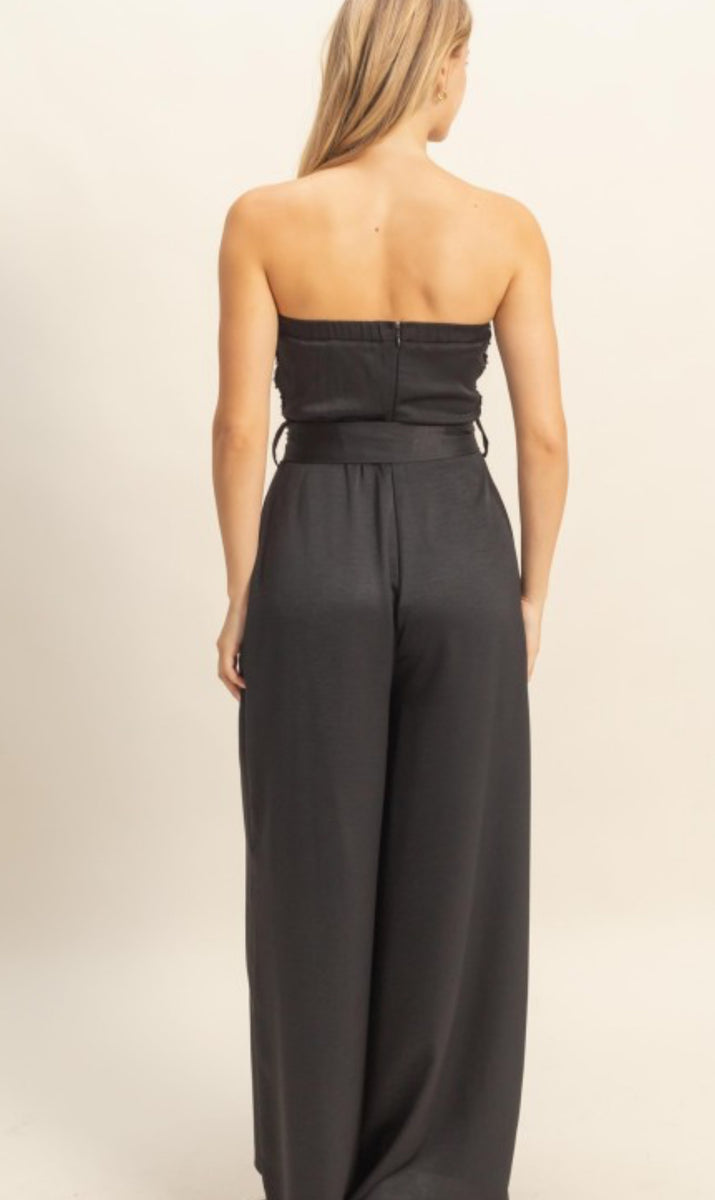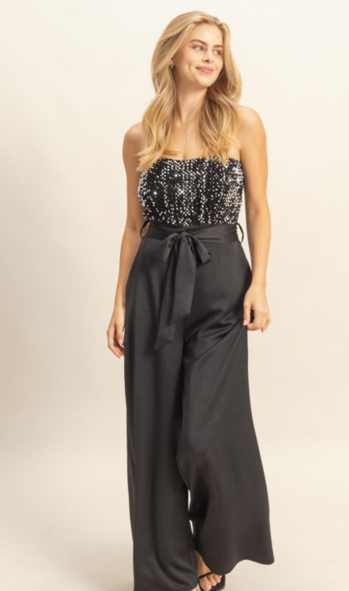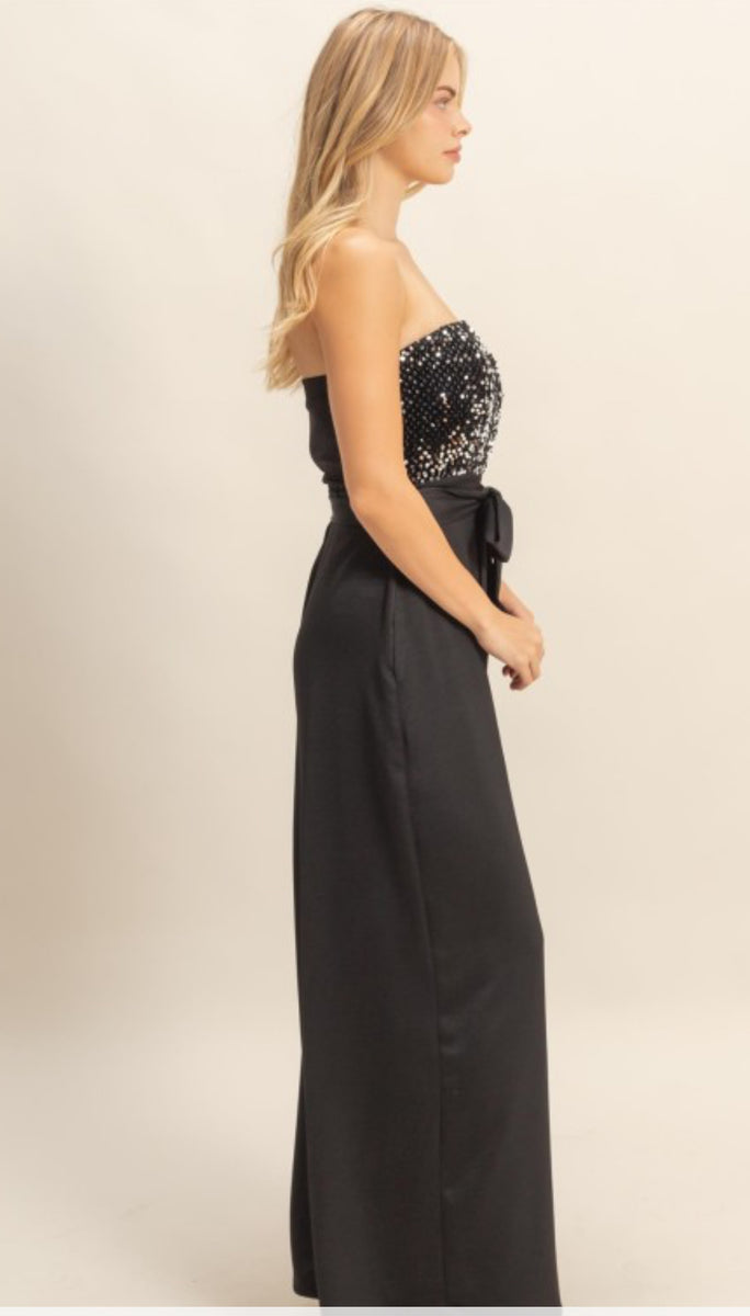 This black satin and sequin jumpsuit is the perfect addition to your holiday wardrobe. With its elegant design and eye-catching features, you'll stand out at any holiday event. Elevate your style and embrace the festive season with the E879 jumpsuit.