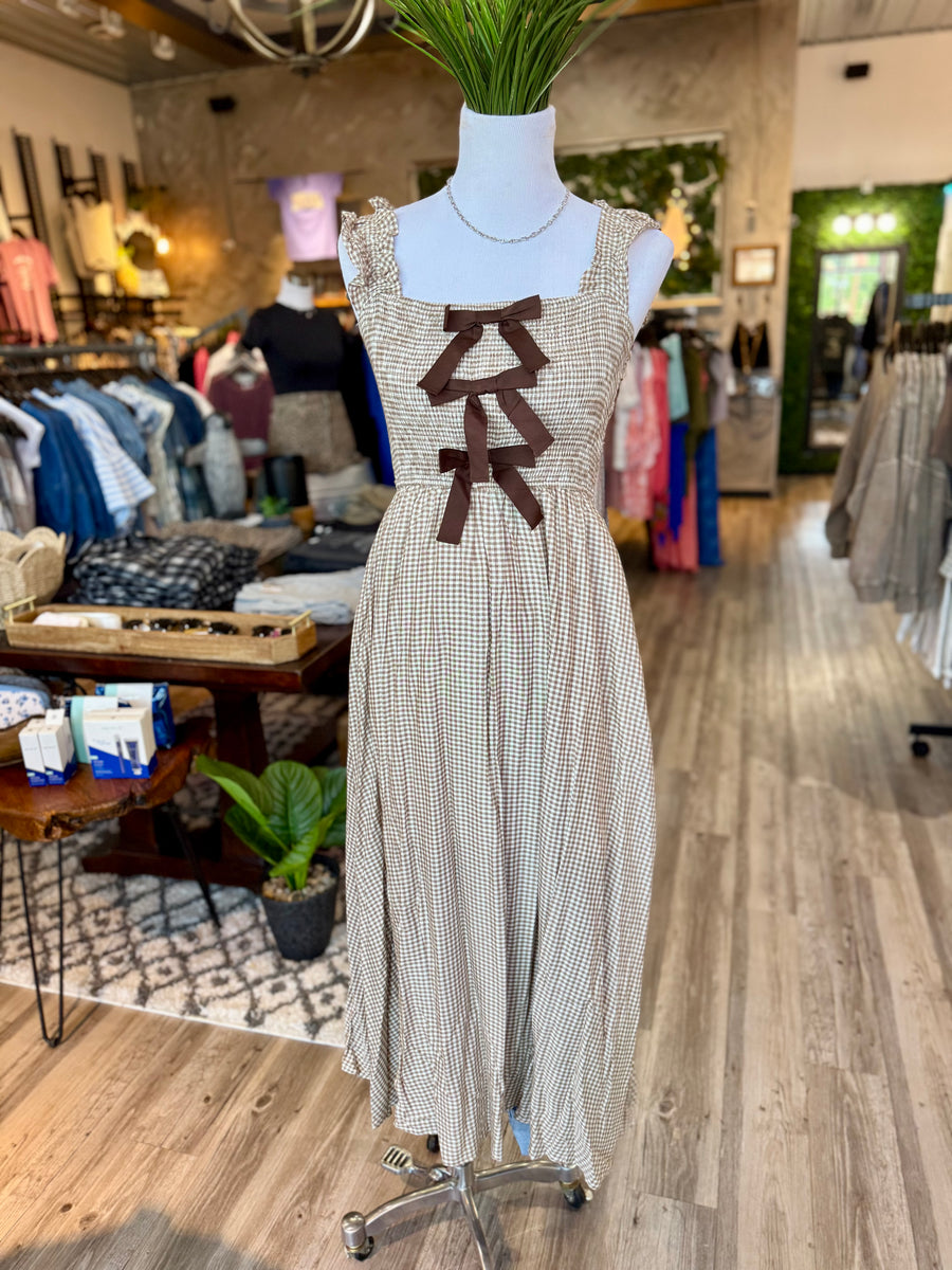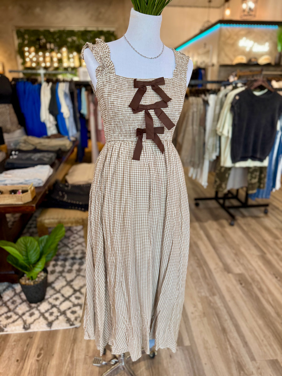 Elevate your style with the R2649 Tan Plaid Midi Dress. Featuring charming front bows, this dress is both elegant and comfortable. True to size, it's the perfect addition to your wardrobe. Embrace a classic yet modern look with this must-have dress.