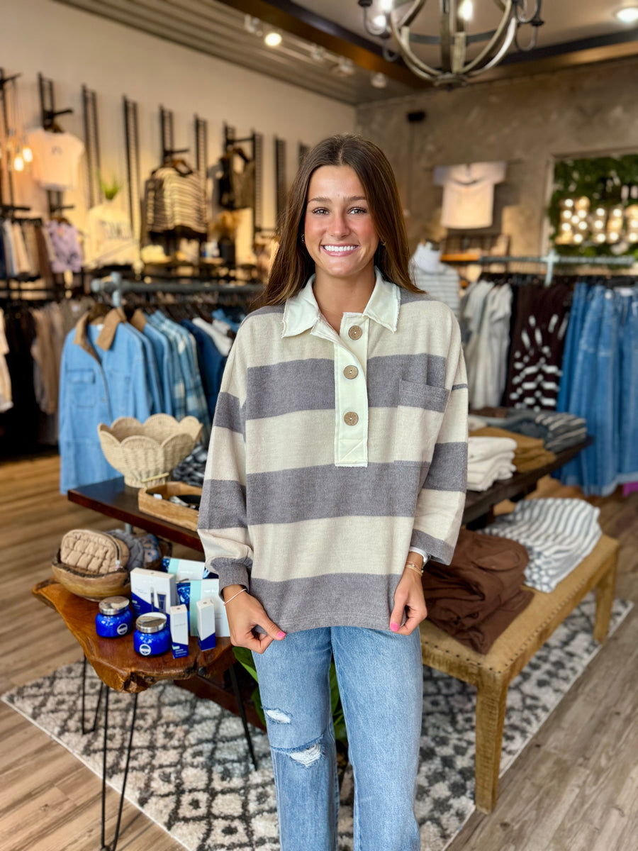 Effortlessly chic, this 1013 Stripe top features a gray and ivory collar with a relaxed fit for ultimate comfort. Made from super soft material, this top is the perfect addition to any wardrobe.