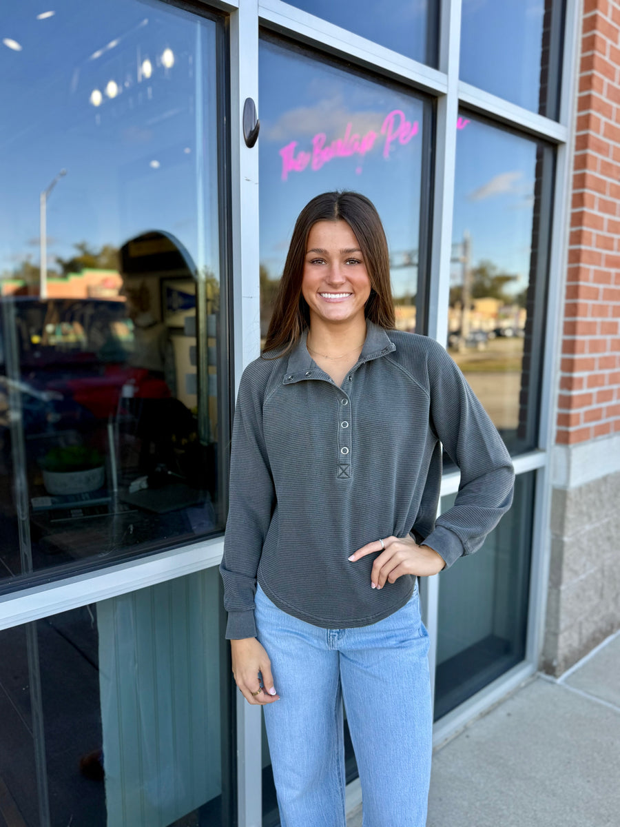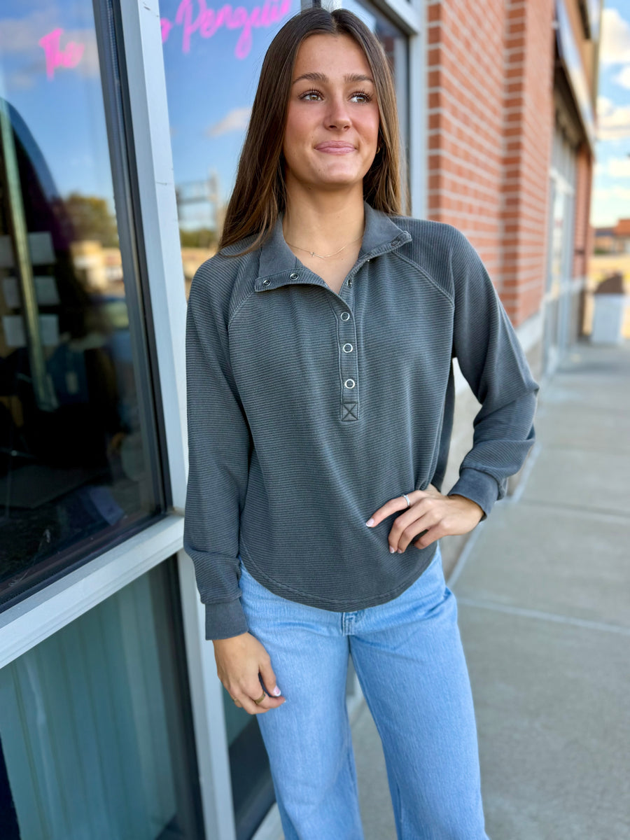 This ribbed Henley pullover offers easy snap buttons and a comfortable fit. A must-have staple for any wardrobe.