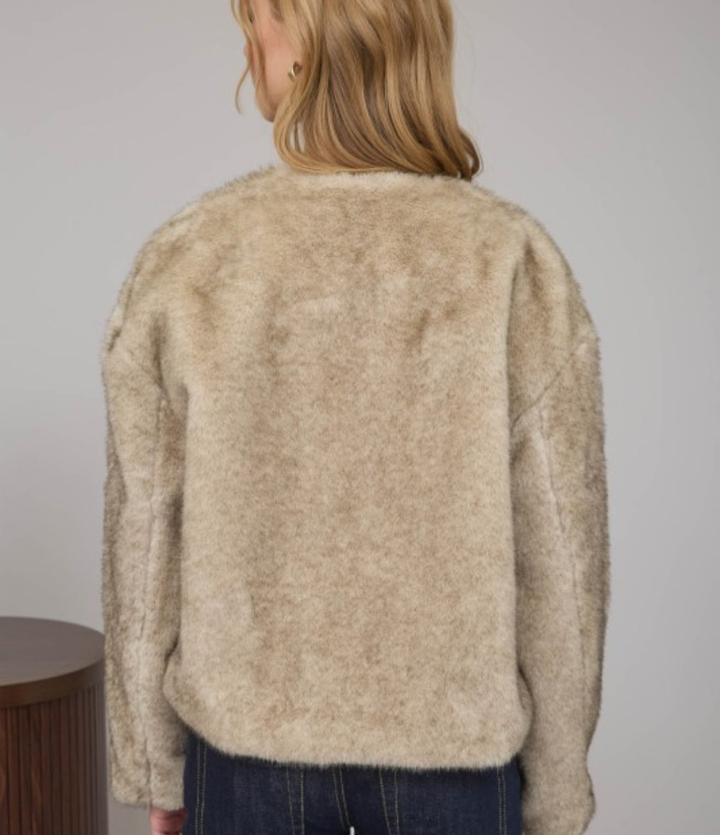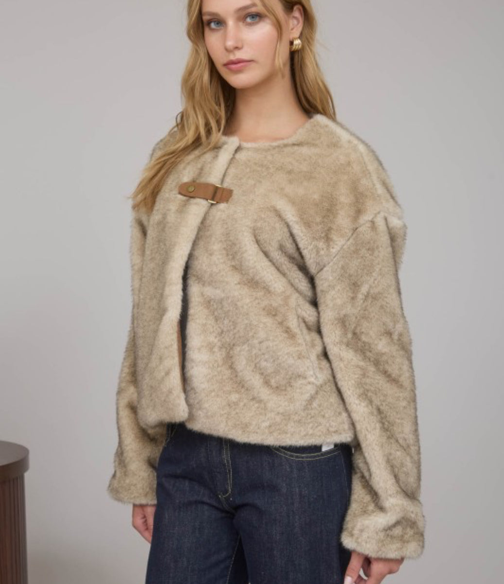 Stay cozy and stylish with our Tan Fur Jacket. The front buckle adds a touch of detail while keeping you warm. Perfect for any occasion, this jacket is a must-have for your wardrobe.