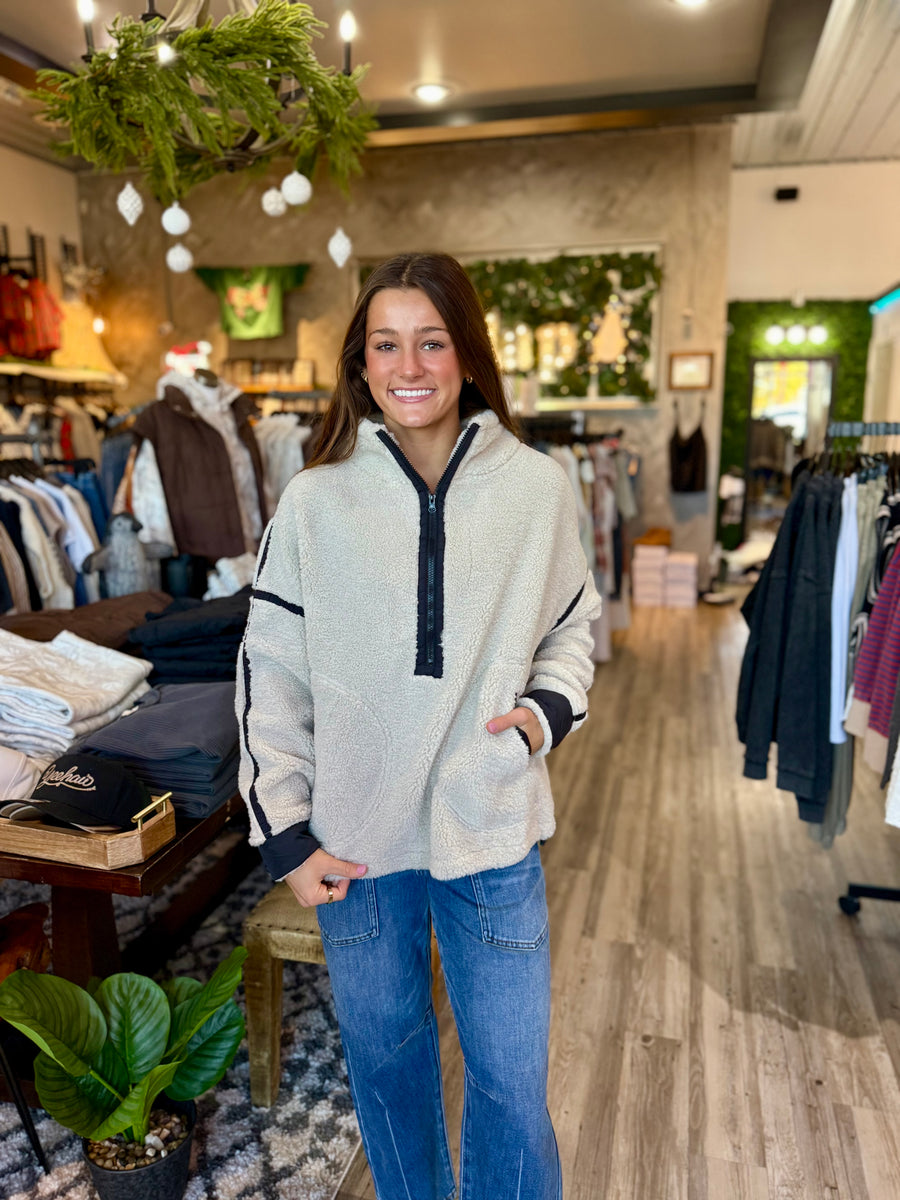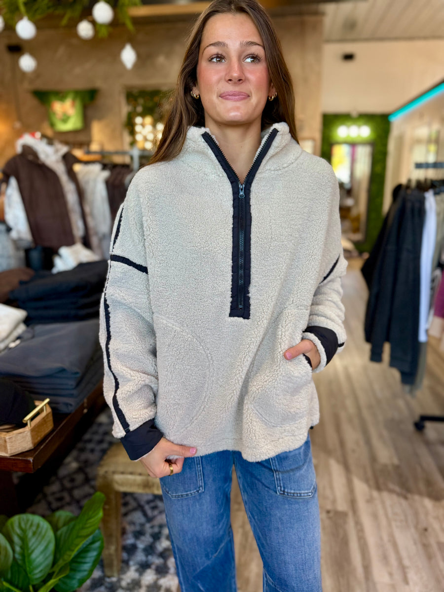 Stay warm and stylish in our 1179 oatmeal fleece pullover. Featuring black trim and a convenient zipper, this relaxed-fit top is a perfect dupe for Free People. Keep cozy all day long.