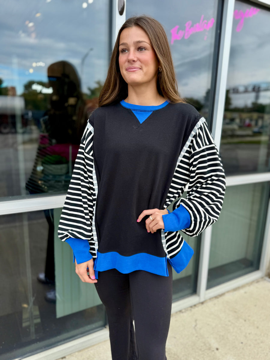 Stay stylish and comfortable with our 12221 pullover. Featuring a relaxed fit, this black pullover is accented with royal blue trim and stripes for a touch of color. Perfect for any casual occasion.