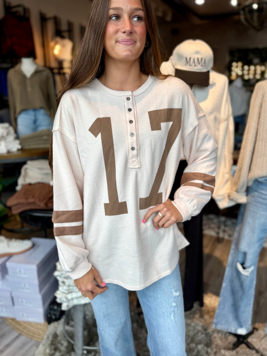 Stay warm and stylish with our Varsity Thermal Waffle Henley. Featuring a bold '17' graphic, this shirt is perfect for any casual occasion. Plus, it fits true to size for a comfortable and flattering fit.