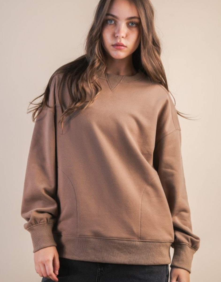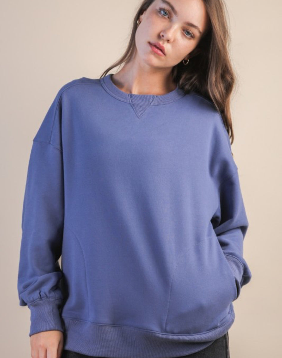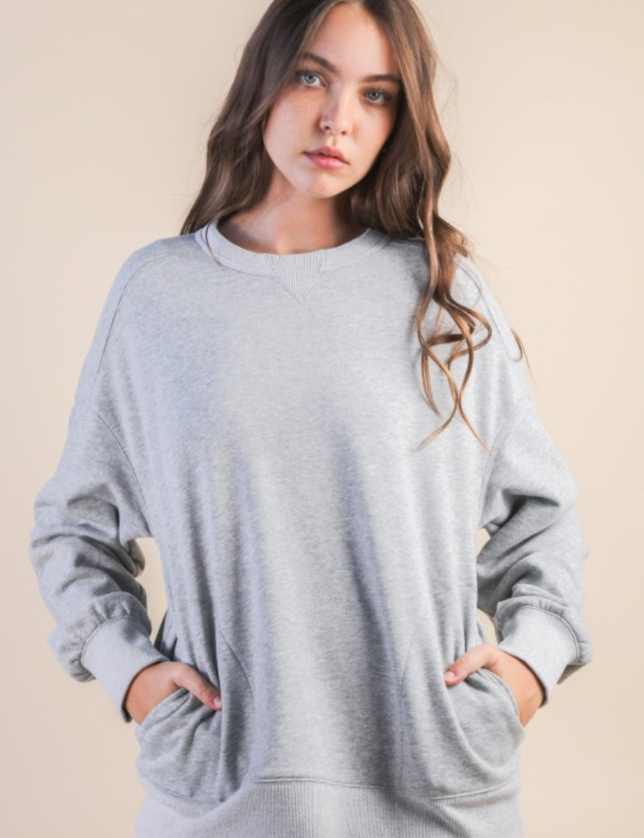 "Stay cozy and comfortable in our Basic sweatshirt pullover. Available in gray, blue, and brown, this relaxed fit pullover features convenient side pockets for your essentials."
