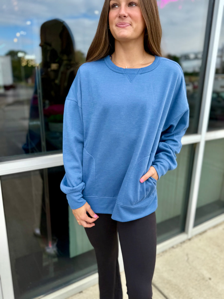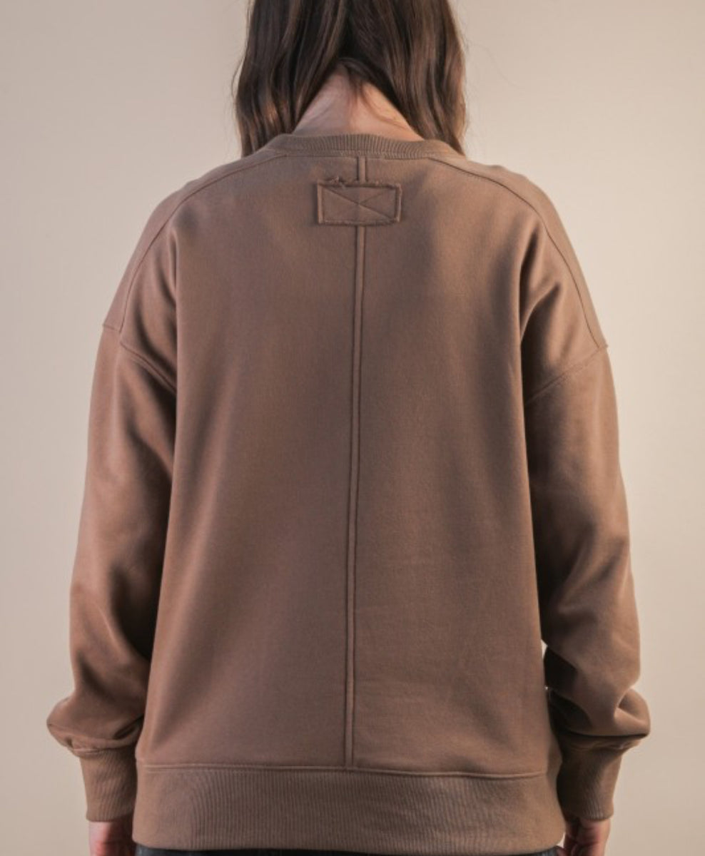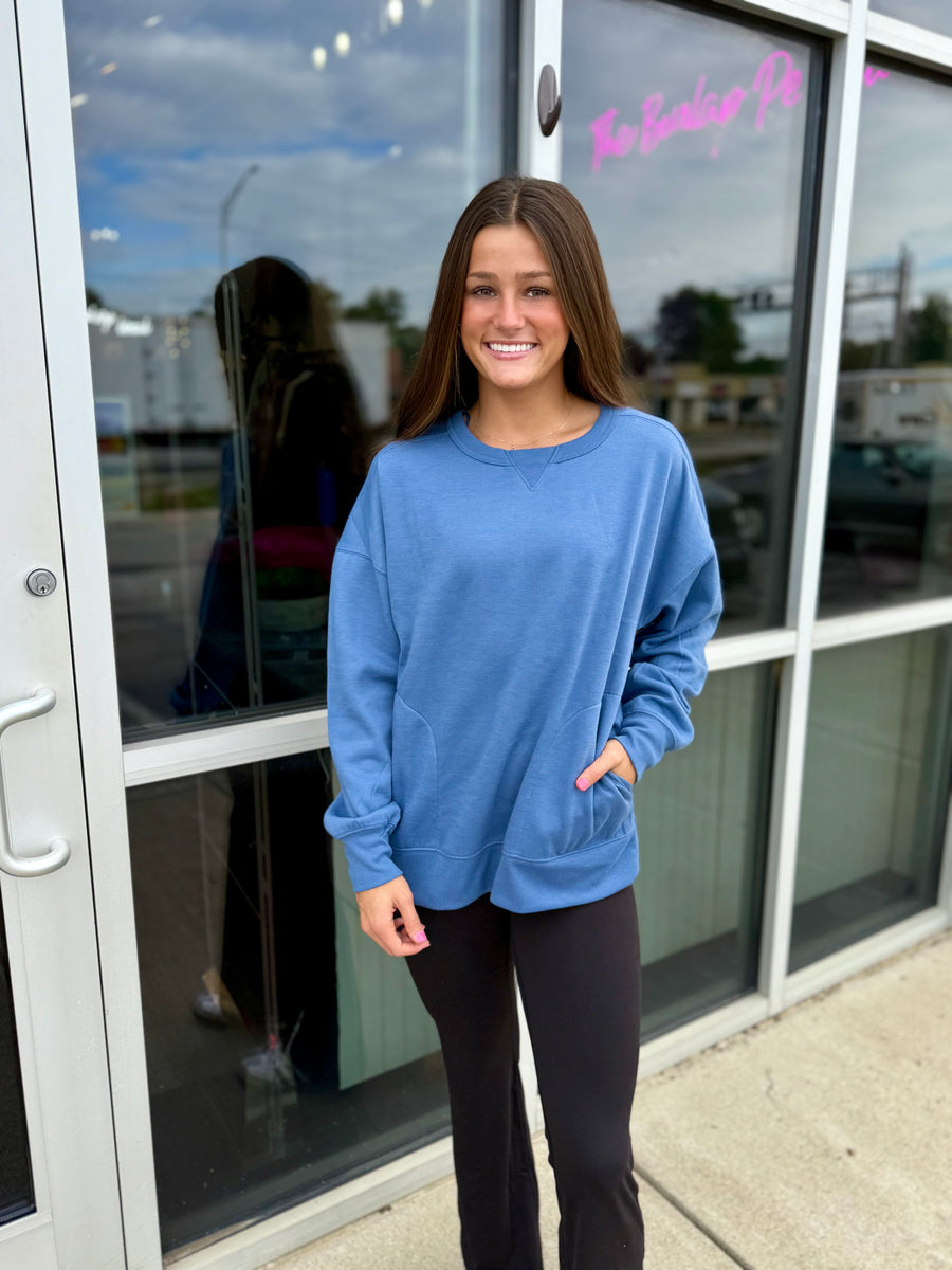 "Stay cozy and comfortable in our Basic sweatshirt pullover. Available in gray, blue, and brown, this relaxed fit pullover features convenient side pockets for your essentials."